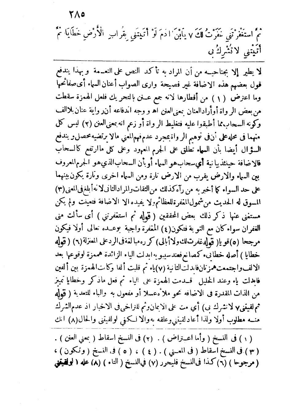 بوعده تعالى أولاً فيكون مرجحاً قوياً. قوله: (غفرت لك ولا أبالي) كرره مبالغة في الرد على المعتزلة. قوله: (خطايا) أصله خطايئ كمصانع فعند سيبويه أبدلت الياء الزائدة همزة لوقوعها بعد الألف واجتمعت همزتان فأبدلت الثانية ياء ثم قلبت ألفاً وكانت الهمزة بين ألفين فأبدلت ياء وعند الخليل قدمت الهمزة على الياء ثم فعل ما ذكر وخطايا تمييز من الذات المقدرة في الإضافة نحو ملأه عسلاً أو مفعول به والباء للتعدية. قوله: (ثم لقيتني لا تشرك بي) أي مت على الإيمان وثم للتراخي في الأخبار إذ عدم الشرك منه مطلوب أولاً ولذا أعاد لقيتني وعلقه به وإلا لكفى لو لقيتني والحال إنك