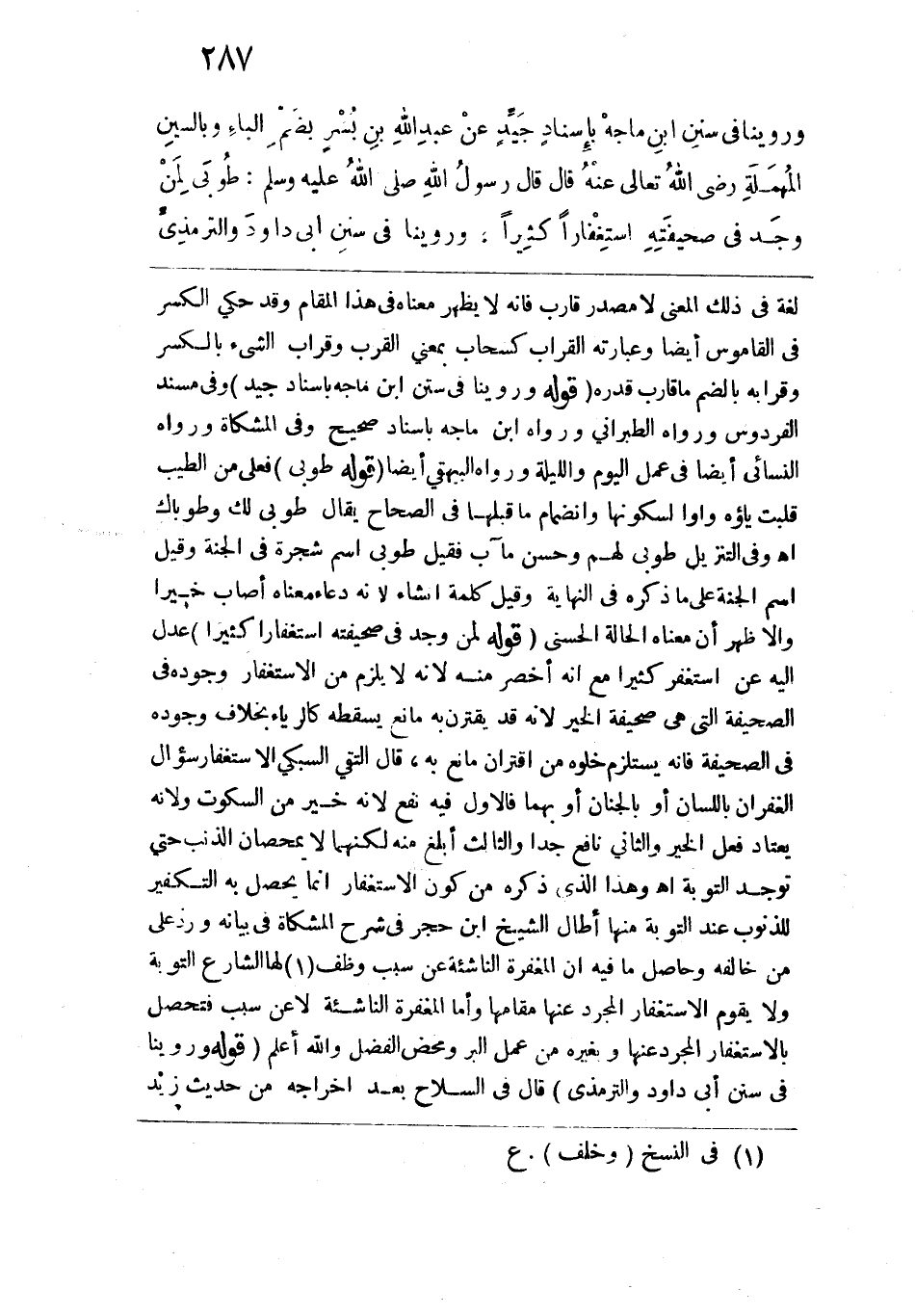 وروينا في سنن ابن ماجه بإسناد جيد عن عبد الله بن بُسْر -بضم الباء وبالسين المهملة- رضي الله تعالى عنه قال: قال رسول الله -صلى الله عليه وسلم-: "طوبَى لِمَنْ وَجدَ في صَحِيفَتِهِ اسْتِغْفَاراً كَثِيراً".