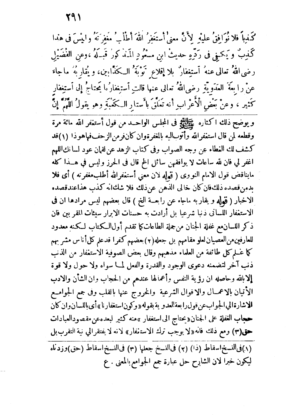 ويوضح ذلك إكثاره -صلى الله عليه وسلم- في المجلس الواحد من قول أستغفر الله مائة مرة وقطعه لمن قال أستغفر الله وأتوب إليه بالمغفرة وإن كان فر من الزحف فها هو ذا قد كشف لك الغطاء عن وجه الصواب وفي كتاب الزهد عن لقمانن عود لسانك: اللهم اغفر لي فإن الله ساعات لا يوافقهن سائل الخ قال في الحرز وليس في هذا كله ما يناقض قول الإِمام النووي. قوله: (لأن معنى أستغفر الله أطلب مغفرته) أي فلا بد من قصده ذلك فإن كان خالي الذهن عن ذلك فلا شك أنه كذب هذا عند قصده الإخبار. قوله: (ويقاربه ما جاء عن رابعة الخ) قال بعضهم ليس مرادها أن في الاستغفار اللساني ذنباً شرعياً بل أرادت به حسنات الأبرار سيئات المقربين فإن ذكر اللسان مع غفلة الجنان من جملة الطاعات كما تقدم أول الكتاب لكنه معدود للعارفين من العصيان لعلو مقامهم بل جعله بعضهم كفراً قد علم كل أناس مشربهم كما علم كل طائفة من العلماء مذهبهم وقال بعض الصوفية الاستغفار من الذنب ذنب آخر لتضمنه دعوى الوجود والقدرة والفعل لما سواه ولا حول ولا قوة إلا بالله وحاصله إن رؤية النفس وأعمالها عندهم من الحجاب وإن الشأن والأدب الإتيان بالأعمال والأقوال الشرعية والخروج عنها بالقلب وفي جمع الجوامع الإشارة إلى الجواب عن قول رابعة العدوية بقوله: "وكون استغفارنا" أي باللسان وإن كان حجاب الغفلة على الجنان "يحتاج إلى استغفار" منه كثير لبعده عن مقصود العبادات حق ومع ذلك فإنه "لا يوجب ترك الاستغفار" لأنه لا يفتقر إلى نية التقرب بل