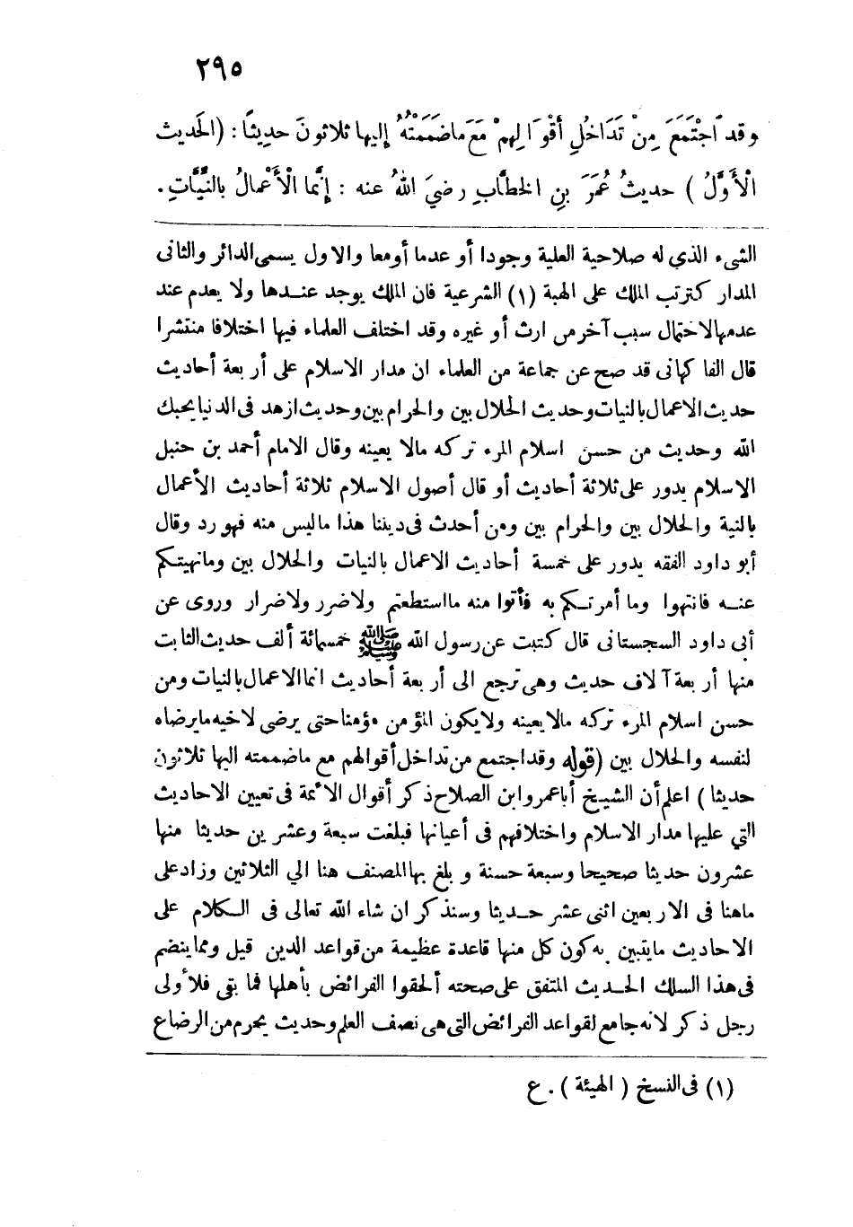 ليس منه فهو رد وقال أبو داود الفقه يدور على خمسة أحاديث الأعمال بالنيات والحلال بين وما نهيتكم عنه فانتهوا وما أمرتكم به فأتوا منه ما استطعتم ولا ضرر ولا ضرار وروي عن أبي داود السجستاني قال: كتبت عن رسول الله -صلى الله عليه وسلم- خمسمائة ألف حديث الثابت منها أربعة آلاف حديث وهي ترجع إلى أربعة أحاديث إنما الأعمال بالنيات ومن حسن إسلام المرء تركه ما لا يعنيه ولا يكون المؤمن مؤمناً حتى يرضى لأخيه ما يرضاه لنفسه والحلال بين. قوله: (وقد اجتمع من تداخل أقوالهم مع ما ضممته إليها ثلاثون حديثاً) اعلم أن الشيخ أبا عمرو بن الصلاح ذكر أقوال الأئمة في تعيين الأحاديث التي عليها مدار الإسلام واختلافهم في أعيانها فبلغت سبعة وعشرين حديثاً منها عشرون حديثاً صحيحاً وسبعة حسنة وبلغ بها المصنف هنا إلى الثلاثين وزاد على ما هنا في الأربعين اثني عشر حديثاً وسنذكر إن شاء الله تعالى في الكلام على الأحاديث ما يتبين به كون كل منها قاعدة عظيمة من قواعد الدين قيل ومما ينضم في هذا السلك الحديث المتفق على صحته ألحقوا الفرائض بأهلها فما بقي فلأولى رجل ذكر لأنه جامع لقواعد الفرائض التي هي نصف العلم وحديث يحرم من الرضاع