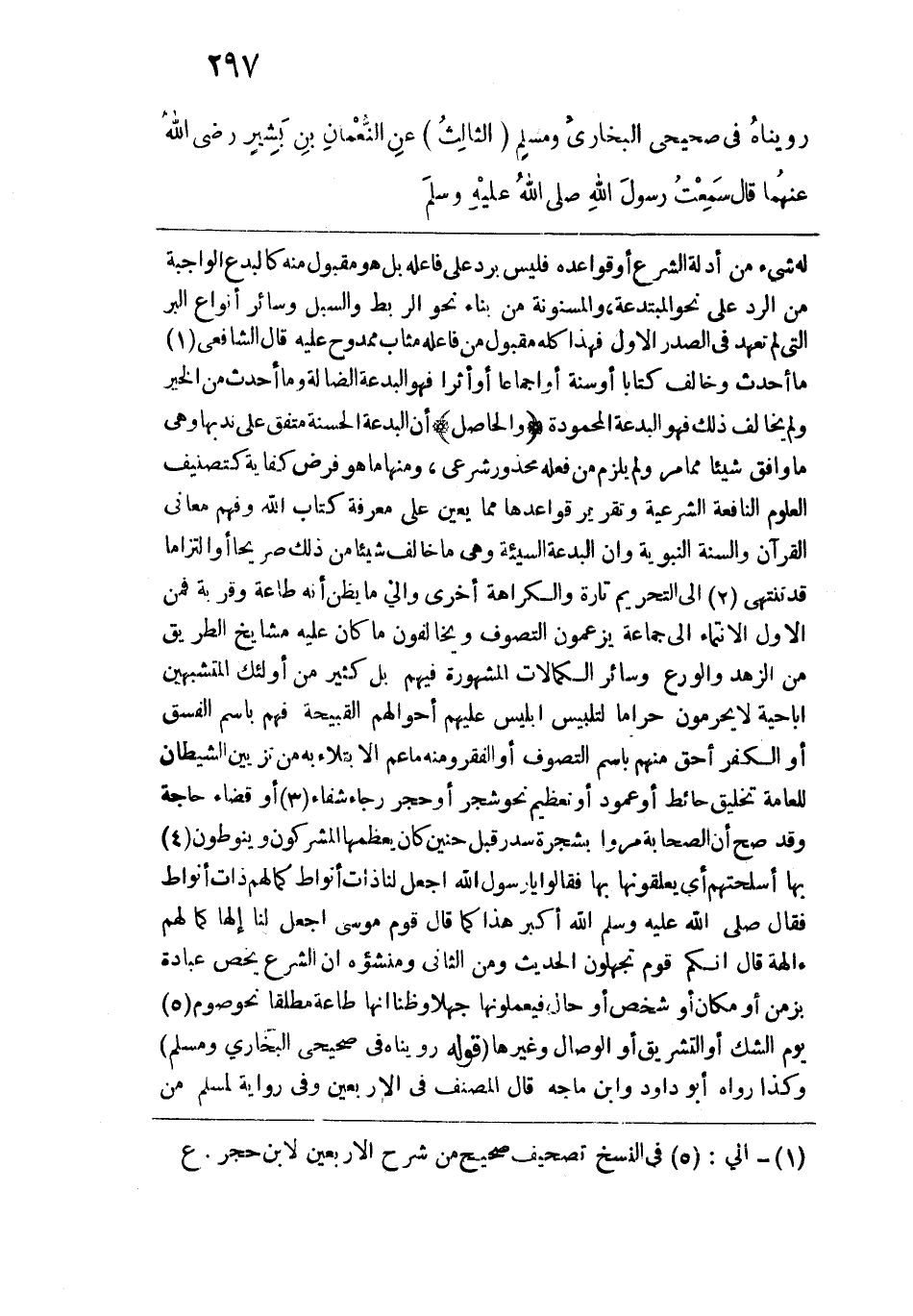 أن البدعة الحسنة متفق على ندبها وهي ما وافق شيئاً مما مر ولم يلزم من فعله محذور شرعي ومنها ما هو فرض كفاية كتصنيف العلوم النافعة الشرعية وتقرير قواعدها مما يعين على معرفة كتاب الله وفهم معاني القرآن والسنة النبوية وإن البدعة السيئة وهي ما خالف شيئاً من ذلك صريحاً أو التزاماً قد تنتهي إلى التحريم تارة والكراهة أخرى وإلى ما يظن أنه طاعة وقربة فمن الأول الانتماء إلى جماعة يزعمون التصوف ويخالفون ما كان عليه مشايخ الطريق من الزهد والورع وسائر الكمالات المشهورة فيهم بل كثير من أولئك المتشبهين إباحية لا يحرمون حراماً لتلبيس إبليس عليهم أحوالهم القبيحة فهم باسم الفسق أو الكفر أحق منهم باسم التصوف أو الفقر ومنه ما عم الابتلاء به من تزيين الشيطان للعامة تخليق حائط أو عمود أو تعظيم نحو شجر أو حجر رجاء شفاء أو قضاء حاجة وقد صح أن الصحابة مروا بشجرة سدر قبل حنين كان يعظمها المشركون وينوطون بها أسلحتهم أي يعلقونها بها فقالوا: يا رسول الله اجعل لنا ذات أنواط كما لهم ذات أنواط فقال -صلى الله عليه وسلم-: "الله أكبر" هذا كما قال قوم موسى: {اجْعَلْ لَنَا إِلَهًا كَمَا لَهُمْ آلِهَةٌ} قال: ({قَالَ إِنَّكُمْ قَوْمٌ تَجْهَلُونَ} الحديث ومن الثاني ومنشؤه أن الشرع يخص عبادة بزمن أو مكان أو شخص أو حال فيعملونها جهلاً وظناً أنها طاعة مطلقاً نحو صوم يوم الشك أو التشريق أو الوصال وغيرها. قوله: (رويناه في صحيحي البخاري ومسلم) وكذا رواه أبو داود وابن ماجه قال المصنف في الأربعين وفي رواية لمسلم: من