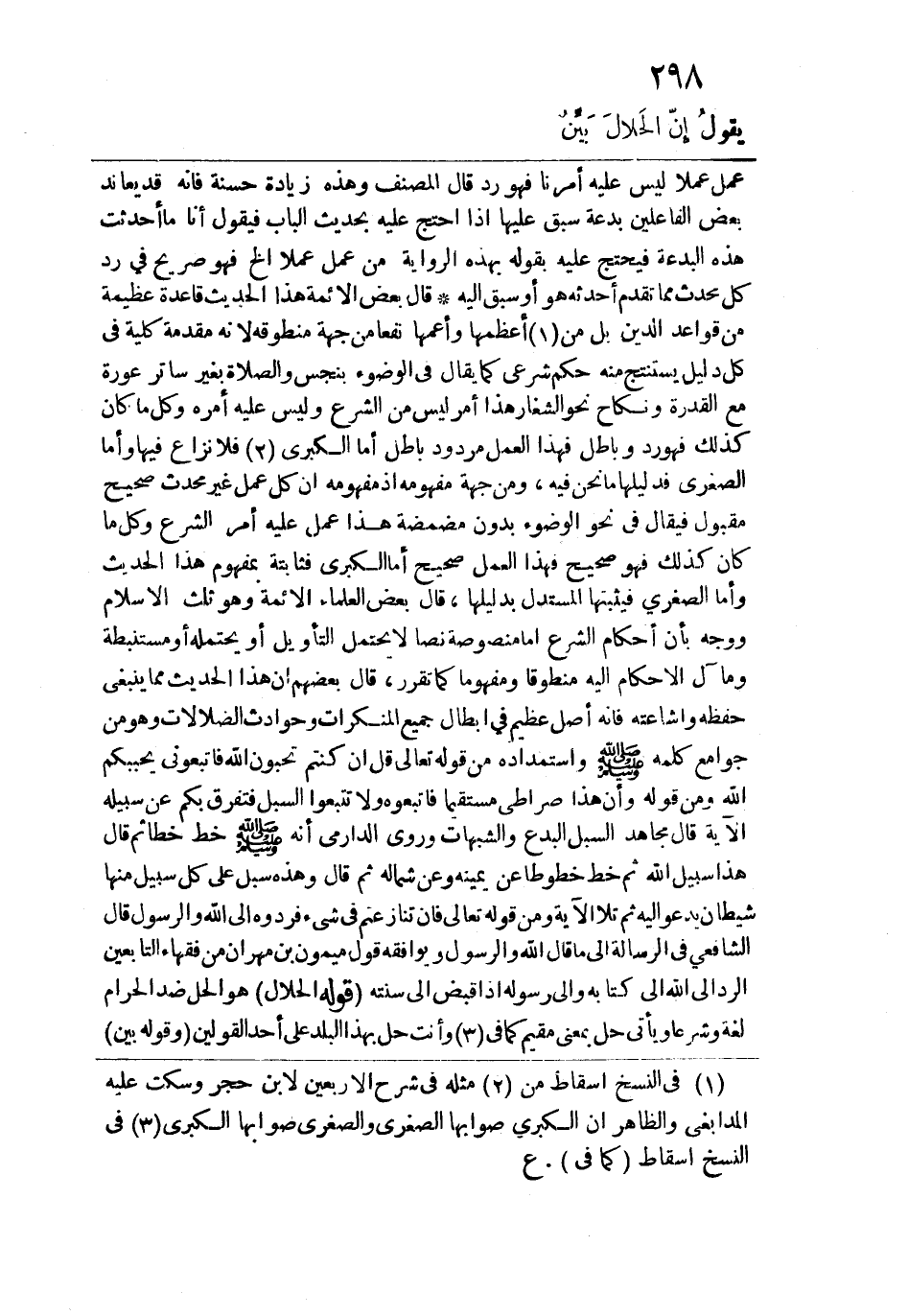 الكبرى فثابتة بمفهوم هذا الحديث وأما الصغرى فيثبتها المستدل بدليلها، قال بعض العلماء الأئمة وهو ثلث الإسلام ووجه بأن أحكام الشرع إما منصوصة نصاً لا يحتمل التأويل أو يحتمله أو مستنبطة ومآل الأحكام إليه منطوقاً ومفهوماً كما تقرر، قال بعضهم إن هذا الحديث مما ينبغي حفظه وإشاعته فإنه أصل عظيم في إبطال جميع المنكرات وحوادث الضلالات وهو من جوامع كلمه -صلى الله عليه وسلم- واستمداده من قوله تعالى: {قُلْ إِنْ كُنْتُمْ تُحِبُّونَ اللهَ فَاتَّبِعُونِي يُحْبِبْكُمُ اللَّهُ} ومن قوله: {وَأَنَّ هَذَا صِرَاطِي مُسْتَقِيمًا فَاتَّبِعُوهُ وَلَا تَتَّبِعُوا السُّبُلَ فَتَفَرَّقَ بِكُمْ عَنْ سَبِيلِهِ} الآية، قال مجاهد: السبل البدع والشبهات وروى الدارمي أنه -صلى الله عليه وسلم- خط خطاً ثم قال: هذا سبيل الله ثم خط خطوطاً عن يمينه وعن شماله ثم قال: وهذه سبل على كل سبيل منها شيطان يدعو إليه ثم تلا الآية ومن قوله تعالى: {فَإِنْ تَنَازَعْتُمْ فِي شَيْءٍ فَرُدُّوهُ إِلَى اللَّهِ وَالرَّسُولِ} قال الشافعي في الرسالة إلى ما قال الله والرسول ويوافقه قول ميمون بن مهران من فقهاء التابعين الرد إلى الله إلى كتابه وإلى رسوله إذا قبض إلى سنته. قوله: (الحلال) هو الحل ضد الحرام لغة وشرعاً ويأتي حل بمعنى مقيم كما في {وَأَنْتَ حِلٌّ بِهَذَا الْبَلَدِ} على أحد القولين. وقوله: (بين)
