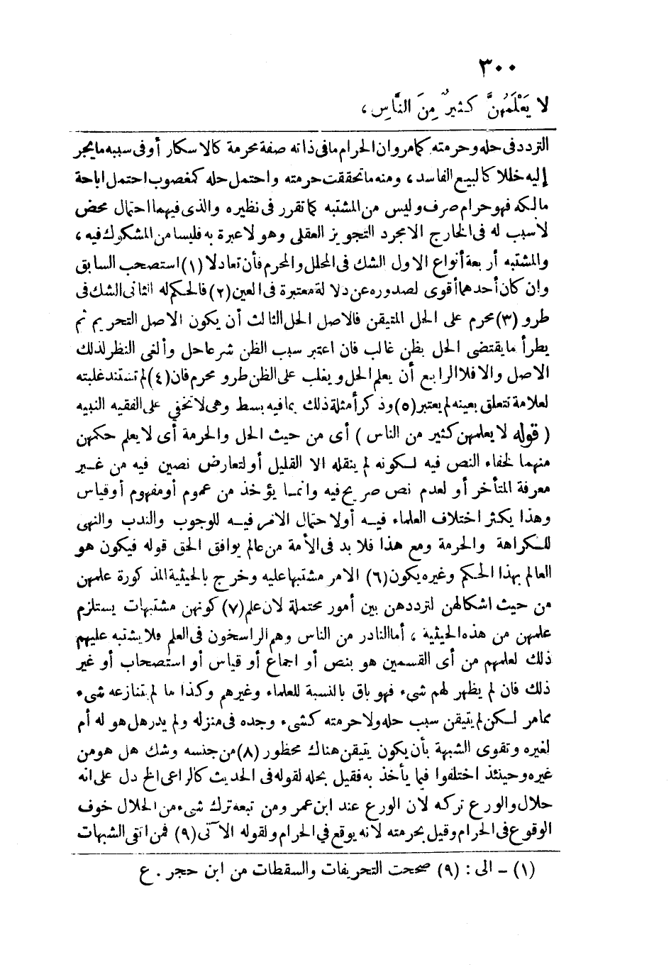 التردد في حله وحرمته كما مر وإن الحرام ما في ذاته صفة محرمة كالإسكار أو في سببه ما يجر إليه خللاً كالبيع الفاسد، ومنه ما تحققت حرمته واحتمل حله كمغصوب احتمل إباحة مالكه فهو حرام صرف وليس من المشتبه كما تقرر في نظيره والذي فيهما احتمال محض لا سبب له في الخارج إلا مجرد التجويز العقلي وهو لا عبرة به فليسا من المشكوك فيه، والمشتبه أربعة أنواع: الأول: الشك في المحلل والمحرم فإن تعادلا استصحب السابق وإن كان أحدهما أقوى لصدوره عن دلالة معتبرة في العين فالحكم له، الثاني: الشك في طرو محرم على الحل المتيقن فالأصل الحل الثالث: أن يكون الأصل التحريم ثم يطرأ ما يقتضي الحل بظن غالب فإن اعتبر سبب الظن شرعاً حل وألغى النظر لذلك الأصل وإلا فلا الرابع: أن يعلم الحل ويغلب على الظن طرو محرم فإن لم تستند غلبته لعلامة تتعلق بعينه لم يعتبر وذكر أمثلة ذلك بما فيه بسط وهي لا تخفى على الفقيه النبيه. قوله: (لا يعلمهن كثير من النّاس) أي من حيث الحل والحرمة أي لا يعلم حكمهن منهما لخفاء النص فيه لكونه لم ينقله إلا القليل أو لتعارض نصين فيه من غير معرفة المتأخر أو لعدم نص صريح فيه وإنما يؤخذ من عموم أو مفهوم أو قياس وهذا يكثر اختلاف العلماء فيه أو لاحتمال الأمر فيه للوجوب والندب والنهي للكراهة والحرمة ومع هذا فلا بد في الأمة من عالم يوافق الحق قوله فيكون هو العالم بهذا الحكم وغيره يكون الأمر مشتبهاً عليه وخرج بالحيثية المذكورة علمهن من حيث أشكالهن لترددهن بين أمور محتملة لأن علم كونهن مشتبهات يستلزم علمهن من هذه الحيثية، أما النادر من النّاس وهم الراسخون في العلم فلا يشتبه عليهم ذلك لعلمهم من أي القسمين هو بنص أو إجماع أو قياس أو استصحاب أو غير ذلك فإن لم يظهر لهم شيء فهو باق بالنسبة للعلماء وغيرهم وكذا ما لم يتنازعه شيء مما مر لكن لم يتيقن سبب حله ولا حرمته كشيء وجده في منزله ولم يدر هل هو له أم لغيره وتقوى الشبهة بأن يكون يتيقن هناك محظور من جنسه وشك هل هو من غيره وحينئذٍ اختلفوا فيما يأخذ به فقيل بحله لقوله في الحديث كالراعي الخ دل على أنه حلال والورع تركه لأن الورع عند ابن عمر ومن تبعه ترك شيء من الحلال خوف الوقوع في الحرام وقيل بحرمته لأنه يوقع في الحرام ولقوله الآتي: فمن اتقى الشبهات