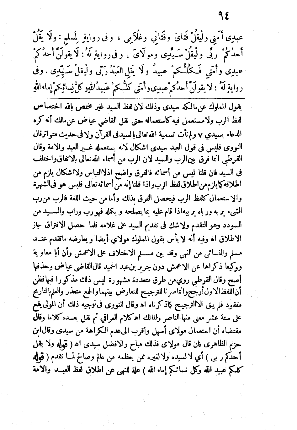 وفي رواية له "لا يَقُولَنَّ أحَدُكُم: عَبْدِي وأمَتي، كُلُّكُمْ عبِيدُ الله، وكُلُّ نِسائِكُمْ إماءُ الله،