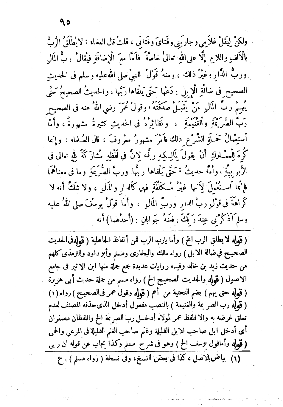 قوله: (لا يطلق الرب الخ) وأما يا رب الرب فمن ألفاظ الجاهلية. قوله: (في الحديث الصحيح في ضالة الإبل) رواه مالك والبخاري ومسلم وأبو داود والترمذي كلهم من حديث زيد بن خالد وفيه روايات عديدة جمع جملة منها ابن الأثير في جامع الأصول. قوله: (والحديث الصحيح الخ) رواه مسلم من جملة حديث أبي هريرة. قوله: (حتى يهم) بضم التحتية من أهم. قوله: (وقول عمر في الصحيح) رواه. قوله: (رب الصريمة والغنيمة) بالنصب مفعول أدخل الذي حذفه المصنف لعدم تعلق غرضه به وإلا فلفظ عمر لمولاه أدخل رب الصريمة الخ واللفظان مصغران أي أدخل إبل صاحب الإبل القليلة وغنم صاحب الغنم القليلة في المرعى والحمى. قوله: (وأما قول يوسف الخ) وهو في شرح مسلم وكذا يجاب عن قوله أن ربي