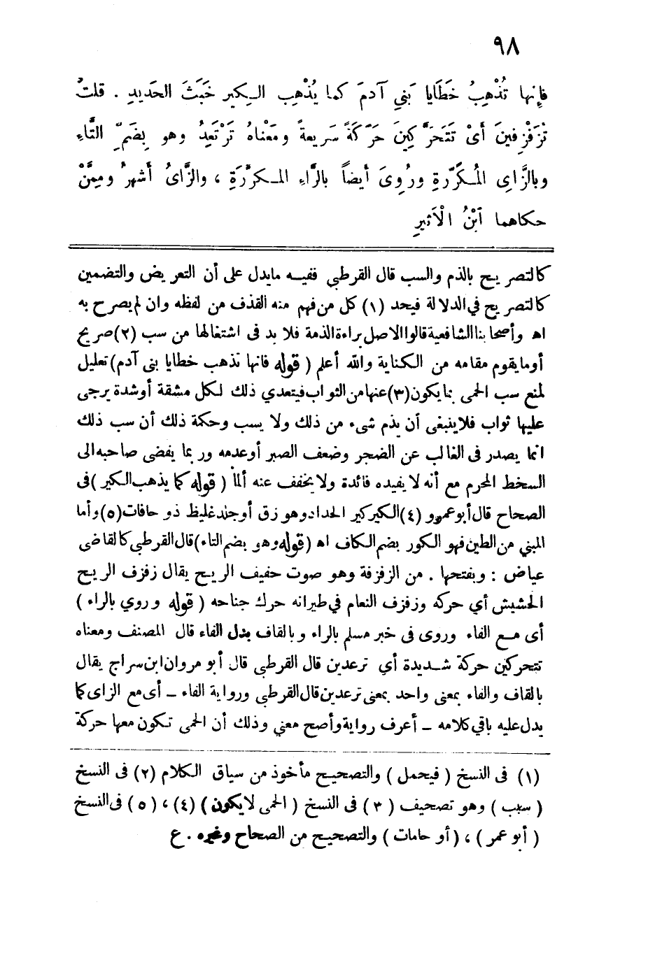 الذمة فلا بد في اشتغالها من سب صريح أو ما يقوم مقامه من الكناية والله أعلم. قوله: (فإنها تذهب خطايا بني آدم) تعليل لمنع سب الحمى بما يكون عنها من الثواب فيتعدى ذلك لكل مشقة أو شدة يرجى عليها ثواب فلا ينبغي أن يذم شيء من ذلك ولا يسب وحكمة ذلك أن سب ذلك إنما يصدر في الغالب عن الضجر وضعف الصبر أو عدمه وربما يفضي صاحبه إلى السخط المحرم مع أنه لا يفيده فائدة ولا يخفف عنه ألماً. قوله: (كما يذهب الكير) في الصحاح قال أبو عمرو الكير كير الحداد وهو زق أو جلد غليظ ذو حافات وأما المبني من الطين فهو الكور بضم الكاف اهـ. قوله: (وهو بضم التاء) قال القرطبي كالقاضي عياض: وبفتحها. من الزفزفة وهو صوت حفيف الريح يقال زفزف الريح الحشيش أي حركه وزفزف النعام في طيرانه حرك جناحه. قوله: (وروي بالراء) أي مع الفاء وروي في خبر مسلم بالراء وبالقاف بدل الفاء قال المصنف ومعناه تتحركين حركة شديدة أي ترعدين قال القرطبي: قال أبو مروان بن سراج يقال بالقاف والفاء بمعنى واحد بمعنى ترعدين قال القرطبي ورواية الفاء -أي مع الزاي كما يدل عليه باقي كلامه- أعرف رواية وأصح معنى وذلك أن الحمى تكون معها حركة