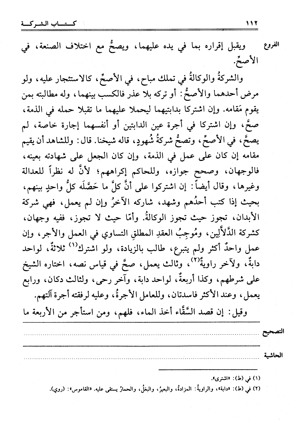 وَالشَّرِكَةُ وَالْوَكَالَةُ فِي تَمَلُّكٍ مُبَاحٍ، فِي الْأَصَحِّ، كَالِاسْتِئْجَارِ عَلَيْهِ، وَلَوْ مَرِضَ أَحَدُهُمَا وَالْأَصَحُّ أَوْ تَرَكَهُ بِلَا عُذْرٍ فَالْكَسْبُ بَيْنَهُمَا، وَلَهُ مُطَالَبَتُهُ وَلَهُ مُطَالَبَتُهُ بِمَنْ يَقُومُ مَقَامَهُ، وَإِنْ اشْتَرَكَا بِدَابَّتَيْهِمَا لِيَحْمِلَا عَلَيْهِمَا مَا تَقَبَّلَا حَمْلَهُ فِي الذِّمَّةِ صَحَّ، وَإِنْ اشْتَرَكَا فِي أُجْرَةِ عَيْنِ الدَّابَّتَيْنِ أَوْ أَنْفُسِهِمَا إجَارَةً خَاصَّةً لَمْ يَصِحَّ، فِي الْأَصَحِّ، وَتَصِحُّ شَرِكَةُ شُهُودٍ، قَالَهُ شَيْخُنَا، قَالَ: وَلِلشَّاهِدِ أن يقيم. مَقَامَهُ إنْ كَانَ عَلَى عَمَلٍ فِي الذِّمَّةِ، وَإِنْ كَانَ الْجُعْلُ عَلَى شَهَادَتِهِ بِعَيْنِهِ فَالْوَجْهَانِ، وَصَحَّ جَوَازُهُ، وَلِلْحَاكِمِ إكْرَاهُهُمْ، لِأَنَّ لَهُ نَظَرًا لِلْعَدَالَةِ وَغَيْرِهَا. وَقَالَ أَيْضًا: إنْ اشْتَرَكُوا عَلَى أَنَّ كُلَّ مَا حَصَّلَهُ كُلُّ وَاحِدٍ بَيْنَهُمْ، بِحَيْثُ إذَا كَتَبَ أَحَدُهُمْ وَشَهِدَ شَارَكَهُ الْآخَرُ وَإِنْ لَمْ يَعْمَلْ فَهِيَ شَرِكَةُ الْأَبَدَانِ، تَجُوزُ حَيْثُ تَجُوزُ الْوَكَالَةُ، وَأَمَّا حَيْثُ لَا تَجُوزُ فَفِيهِ وَجْهَانِ، كَشَرِكَةِ الدَّلَّالِينَ، وَمُوجَبُ الْعَقْدِ الْمُطْلَقِ التَّسَاوِي فِي الْعَمَلِ وَالْأَجْرِ، وَإِنْ عَمِلَ وَاحِدٌ أَكْثَرَ وَلَمْ يَتَبَرَّعْ طَالَبَ بِالزِّيَادَةِ. وَلَوْ اشْتَرَكَ1 ثلاثة لواحد دابة ولآخر رواية2 وَثَالِثٌ يَعْمَلُ صَحَّ فِي قِيَاسٍ نَصَّهُ، اخْتَارَهُ الشَّيْخُ عَلَى شَرْطِهِمْ، وَكَذَا أَرْبَعَةٌ، لِوَاحِدٍ دَابَّةٌ وَآخَرَ رَحًى وَلِثَالِثٍ دُكَّانٌ وَرَابِعٍ يَعْمَلُ، وَعِنْدَ الْأَكْثَرِ فَاسِدَتَانِ وَلِلْعَامِلِ الْأُجْرَةُ، وَعَلَيْهِ لِرُفْقَتِهِ أُجْرَةُ آلَتِهِمْ، وَقِيلَ: إنْ قَصَدَ السَّقَّاءُ أَخْذَ الْمَاءِ فلهم، ومن استأجر من الأربعة ما