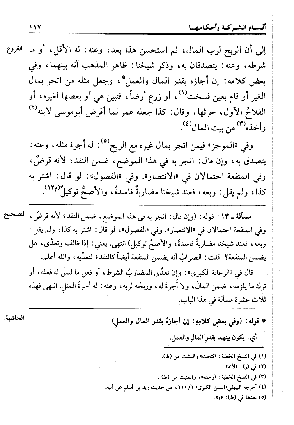 قَالَ فِي الرِّعَايَةِ الْكُبْرَى: وَإِنْ تَعَدَّى الْمُضَارِبُ الشَّرْطَ أَوْ فَعَلَ مَا لَيْسَ لَهُ فِعْلُهُ أَوْ تَرَكَ مَا يَلْزَمُهُ ضَمِنَ الْمَالَ، وَلَا أُجْرَةَ لَهُ، وَرِبْحُهُ لِرَبِّهِ، وَعَنْهُ: لَهُ أُجْرَةُ الْمِثْلِ انْتَهَى. فَهَذِهِ ثَلَاثَ عَشْرَةَ مَسْأَلَةً فِي هَذَا الْبَابِ.