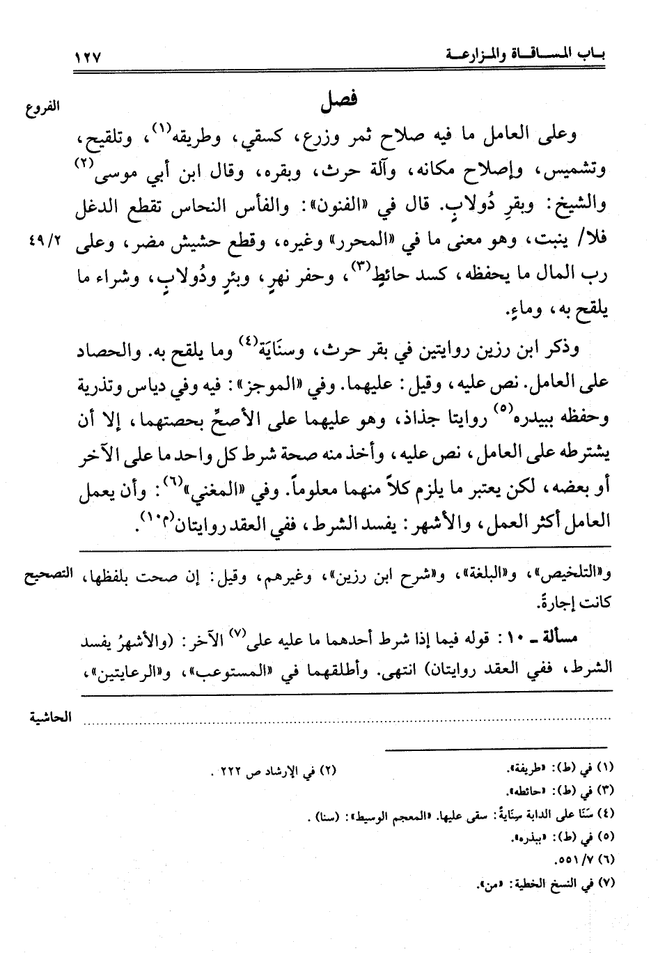 كسقي وطريقة1 وَتَلْقِيحٍ وَتَشْمِيسٍ وَإِصْلَاحِ مَكَانِهِ وَآلَةِ حَرْثٍ وَبَقَرِهِ. وَقَالَ ابْنُ أَبِي مُوسَى2 وَالشَّيْخُ: وَبَقَرُ دُولَابٍ، قَالَ فِي الْفُنُونِ: وَالْفَأْسُ النُّحَاسُ تَقْطَعُ الدَّغَلَ فَلَا يَنْبُتُ، وَهُوَ مَعْنًى فِي الْمُحَرَّرِ وَغَيْرِهِ، وَقَطْعُ حَشِيشٍ مُضِرٍّ، وَعَلَى رَبِّ الْمَالِ مَا يحفظه كسد حائط3 وَحَفْرِ نَهْرٍ وَبِئْرٍ وَدُولَابٍ وَشِرَاءِ مَا يُلَقِّحُ بِهِ وَمَاءٍ.
