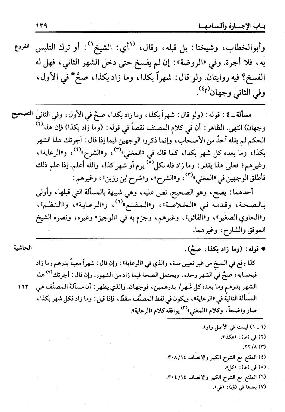 ـــــــــــــــــــــــــــــQمَسْأَلَةٌ-4: قَوْلُهُ: "وَلَوْ قَالَ شَهْرًا بِكَذَا وَمَا زَادَ بِكَذَا صَحَّ فِي الْأَوَّلِ، وَفِي الثَّانِي: وَجْهَانِ" انْتَهَى، الظَّاهِرُ أَنَّ فِي كَلَامِ الْمُصَنِّفِ نَقْصًا فِي قَوْلِهِ "وَمَا زَادَ بِكَذَا" فَإِنَّ هذا2 الْحُكْمَ لَمْ يَقُلْهُ أَحَدٌ مِنْ الْأَصْحَابِ، وَإِنَّمَا ذَكَرُوا الْوَجْهَيْنِ فِيمَا إذَا قَالَ آجَرْتُك هَذَا الشَّهْرَ بِكَذَا وَمَا بَعْدَهُ كُلَّ شَهْرٍ بِكَذَا، كَمَا قَالَهُ فِي الْمُغْنِي3 وَالشَّرْحِ4 وَالرِّعَايَةِ وَغَيْرِهِمْ، فعلى هذا يقدر وما زاد فله بكل5 يَوْمٍ أَوْ شَهْرٍ كَذَا وَاَللَّهُ أَعْلَمُ. إذَا عَلِمَ ذَلِكَ فَأَطْلَقَ الْوَجْهَيْنِ فِي الْمُغْنِي3 وَالشَّرْحِ وَشَرْحِ ابْنِ رَزِينٍ وَغَيْرِهِمْ: