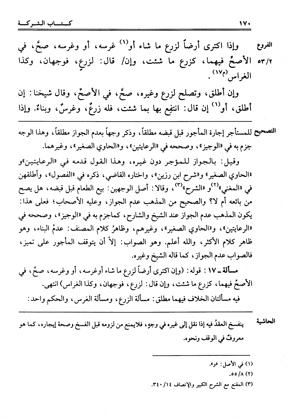مَسْأَلَةٌ-17: قَوْلُهُ: "وَإِنْ اكْتَرَى أَرْضًا لِزَرْعِ مَا شَاءَ أَوْ غَرْسِهِ أَوْ وَغَرْسِهِ صَحَّ، فِي الْأَصَحِّ فِيهِمَا، كَازْرَعْ مَا شِئْت وَإِنْ قَالَ: لِزَرْعٍ، فَوَجْهَانِ، وَكَذَا الْغِرَاسُ" انْتَهَى. فِيهِ مَسْأَلَتَانِ الْخِلَافُ فِيهِمَا مُطْلَقٌ، مَسْأَلَةُ الزَّرْعِ وَمَسْأَلَةُ الغرس والحكم واحد: