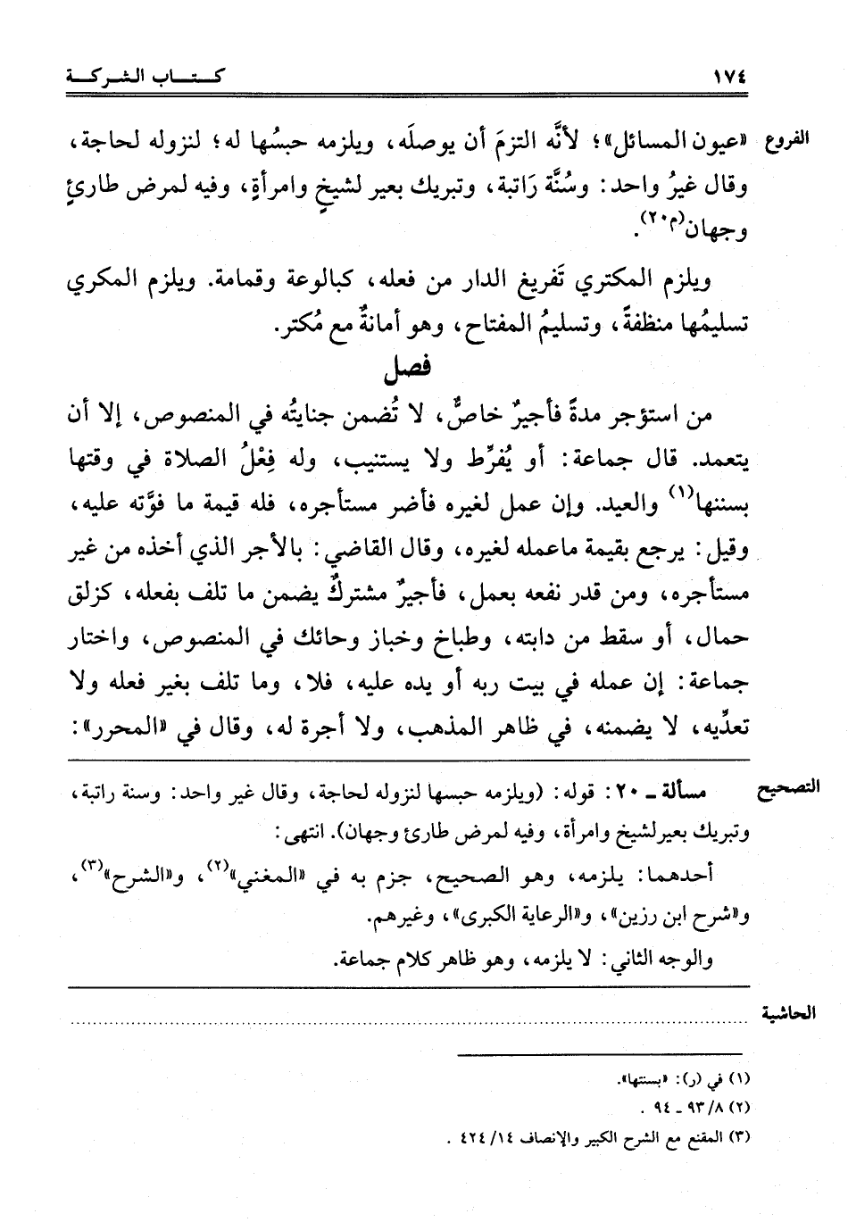 عُيُونِ الْمَسَائِلِ، لِأَنَّهُ الْتَزَمَ أَنْ يُوَصِّلَهُ، وَيَلْزَمُهُ حَبْسُهَا لَهُ لِنُزُولِهِ لِحَاجَةٍ، وَقَالَ غَيْرُ وَاحِدٍ: وَسَنَةٌ رَاتِبَةٌ، وَتَبْرِيكُ بَعِيرٍ لِشَيْخٍ وَامْرَأَةٍ، وَفِيهِ لِمَرَضٍ طَارِئٍ وَجْهَانِ "م20".