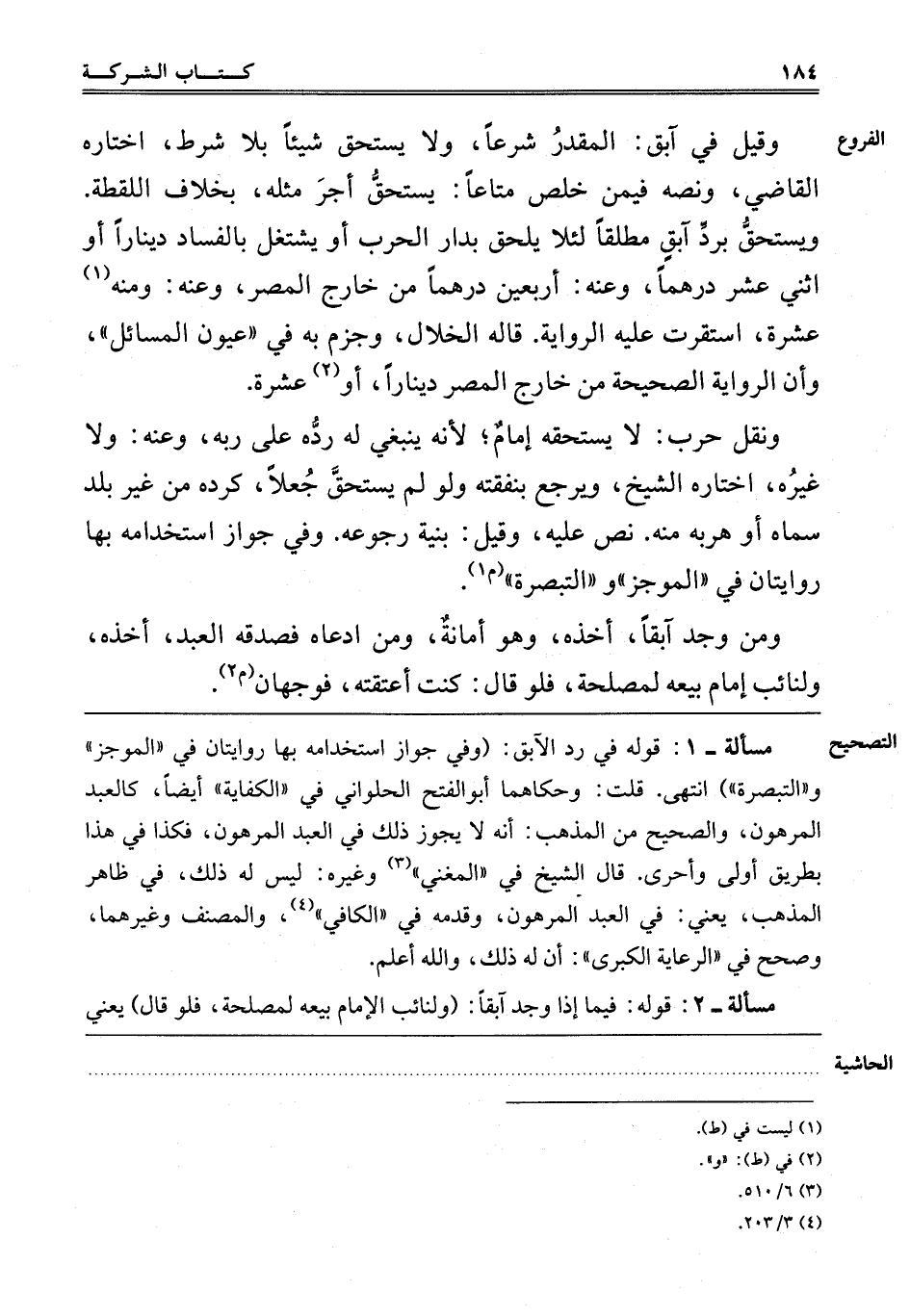 ـــــــــــــــــــــــــــــQمَسْأَلَةٌ-1: قَوْلُهُ فِي رَدِّ الْآبِقِ: "وَفِي جَوَازِ استخدامه بها روايتان في الموجز، وَالتَّبْصِرَةِ" انْتَهَى. قُلْت وَحَكَاهُمَا أَبُو الْفَتْحِ الْحَلْوَانِيُّ فِي الْكِفَايَةِ أَيْضًا، كَالْعَبْدِ الْمَرْهُونِ، وَالصَّحِيحُ مِنْ الْمَذْهَبِ أَنَّهُ لَا يَجُوزُ ذَلِكَ فِي الْعَبْدِ الْمَرْهُونِ، فَكَذَا فِي هَذَا بِطَرِيقٍ أَوْلَى وَأَحْرَى، قَالَ الشَّيْخُ فِي الْمُغْنِي3 وَغَيْرِهِ: لَيْسَ لَهُ ذَلِكَ، فِي ظَاهِرِ الْمَذْهَبِ، يَعْنِي فِي الْعَبْدِ الْمَرْهُونِ، وَقَدَّمَهُ فِي الْكَافِي4 وَالْمُصَنِّفُ وَغَيْرِهِمَا، وَصَحَّحَ فِي الرِّعَايَةِ الْكُبْرَى أَنَّ لَهُ ذَلِكَ. وَاَللَّهُ أَعْلَمُ.