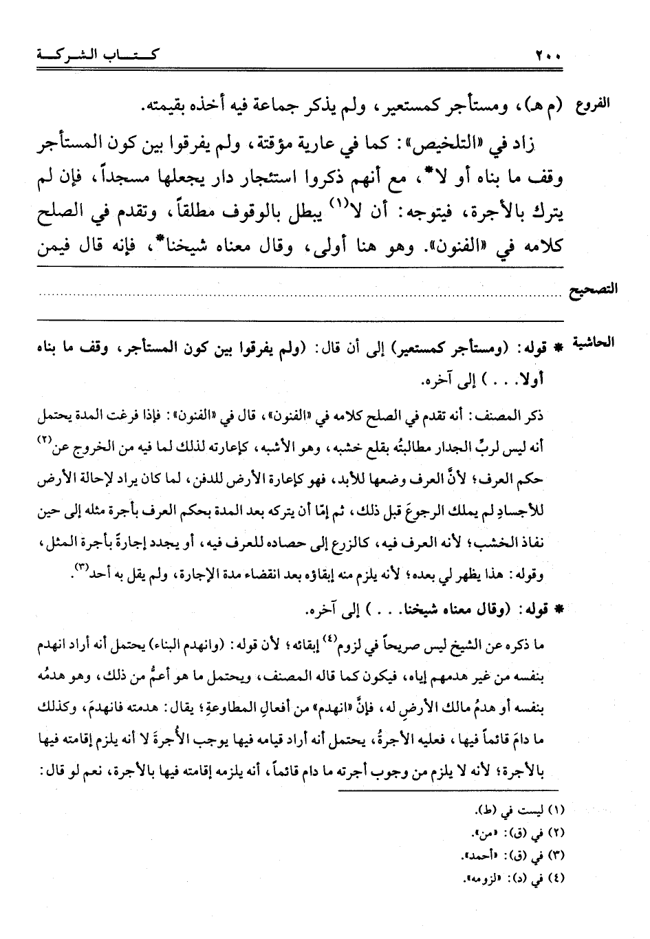 زَادَ فِي التَّلْخِيصِ: كَمَا فِي عَارِيَّةٍ مُؤَقَّتَةٍ، وَلَمْ يُفَرِّقُوا بَيْنَ كَوْنِ الْمُسْتَأْجِرِ وَقَفَ مَا بَنَاهُ أَوْ لَا، مَعَ أَنَّهُمْ ذَكَرُوا اسْتِئْجَارَ دَارٍ يَجْعَلُهَا مَسْجِدًا، فَإِنْ لم يترك بالأجرة فيتوجه أن لا1 يَبْطُلَ بِالْوُقُوفِ مُطْلَقًا، وَتَقَدَّمَ فِي الصُّلْحِ كَلَامُهُ في الْفُنُونِ. وَهُوَ هُنَا أَوْلَى، وَقَالَ مَعْنَاهُ شَيْخُنَا، فإنه قال فيمن