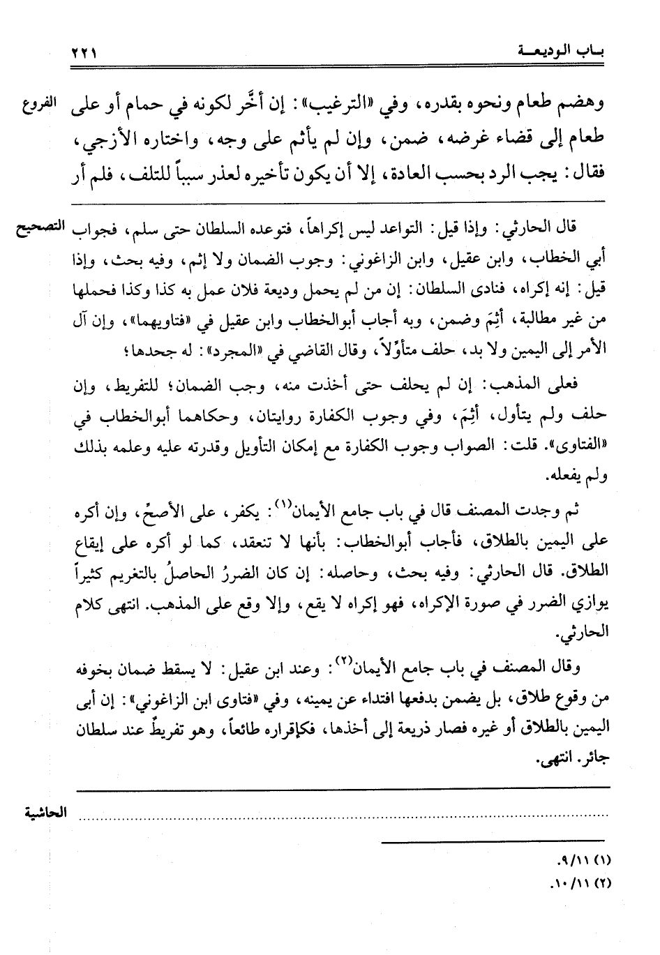 ـــــــــــــــــــــــــــــQقال الحارثي: وإذا قيل التواعد لَيْسَ إكْرَاهًا فَتَوَعَّدَهُ السُّلْطَانُ حَتَّى سَلَّمَ فَجَوَابُ أَبِي الْخَطَّابِ وَابْنِ عَقِيلٍ وَابْنِ الزَّاغُونِيِّ وُجُوبُ الضَّمَانِ وَلَا إثْمَ، وَفِيهِ بَحْثٌ، وَإِذَا قِيلَ إنَّهُ إكْرَاهٌ فَنَادَى السُّلْطَانُ إنَّ مَنْ لَمْ يَحْمِلْ وَدِيعَةَ فُلَانٍ عُمِلَ بِهِ كَذَا وَكَذَا فَحَمَلَهَا مِنْ غَيْرِ مُطَالَبَةٍ أَثِمَ وَضَمِنَ، وَبِهِ أَجَابَ أَبُو الْخَطَّابِ وَابْنُ عَقِيلٍ فِي فَتَاوِيهِمَا، وَإِنْ آلَ الْأَمْرُ إلَى الْيَمِينِ وَلَا بُدَّ حَلَفَ مُتَأَوِّلًا. وَقَالَ الْقَاضِي فِي الْمُجَرَّدِ: لَهُ جَحْدُهَا،