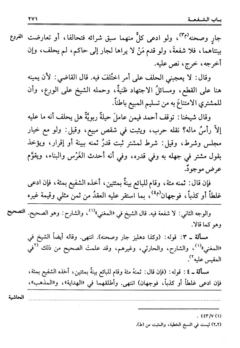 جَارٍ وَصَحْنُهُ "م 3"، وَلَوْ ادَّعَى كُلٌّ مِنْهُمَا سَبْقَ شِرَائِهِ فَتَحَالَفَا أَوْ تَعَارَضَتْ بَيِّنَتُهُمَا فَلَا شُفْعَةَ، وَلَوْ قُدِّمَ مَنْ لَا يَرَاهَا لِجَارٍ إلى حاكم لم يحلف، وإن أَخْرَجَهُ خَرَجَ، نُصَّ عَلَيْهِ.