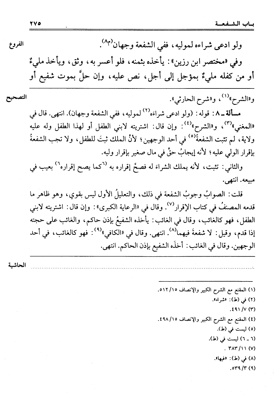قُلْت: الصَّوَابُ وُجُوبُ الشُّفْعَةِ فِي ذَلِكَ، وَالتَّعْلِيلُ الْأَوَّلُ لَيْسَ بِقَوِيٍّ، وَهُوَ ظَاهِرُ مَا قَدَّمَهُ الْمُصَنِّفُ فِي كِتَابِ الْإِقْرَارِ7. وَقَالَ فِي الرِّعَايَةِ الْكُبْرَى: وَإِنْ قَالَ اشْتَرَيْته لِابْنِي الطِّفْلِ فَهُوَ كَالْغَائِبِ، وَقَالَ فِي الْغَائِبِ: يَأْخُذُهُ الشَّفِيعُ بِإِذْنِ حَاكِمٍ، وَالْغَائِبُ عَلَى حجته إذا قدم، وقبل: لا شفعة فيهما8 انْتَهَى. وَقَالَ فِي الْكَافِي9: فَهُوَ كَالْغَائِبِ، فِي أَحَدِ الْوَجْهَيْنِ. وَقَالَ فِي الْغَائِبِ: أَخَذَهُ الشَّفِيعُ بإذن الحاكم انتهى.