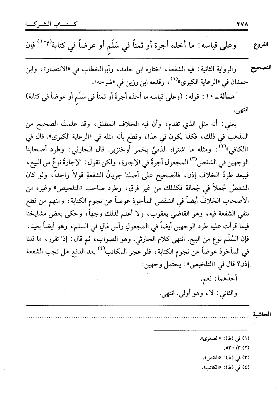 يَعْنِي: أَنَّهُ مِثْلُ الَّذِي تَقَدَّمَ، وَأَنَّ فِيهِ الْخِلَافَ الْمُطْلَقَ، وَقَدْ عَلِمْت الصَّحِيحَ مِنْ الْمَذْهَبِ مِنْ ذَلِكَ، فَكَذَا يَكُونُ فِي هَذَا، وَقَطَعَ بأنه مثله في الرعاية الكبرى، قَالَ فِي الْكَافِي2: وَمِثْلُهُ مَا اشْتَرَاهُ الذِّمِّيُّ بِخَمْرٍ أَوْ خِنْزِيرٍ، قَالَ الْحَارِثِيُّ: وَطَرَدَ أَصْحَابُنَا الوجهين في الشقص3 الْمَجْعُولِ أَجْرُهُ فِي الْإِجَارَةِ، وَلَكِنْ نَقُولُ: الْإِجَارَةُ نَوْعٌ مِنْ الْبَيْعِ، فَيَبْعُدُ طَرْدُ الْخِلَافِ إذَنْ، فَالصَّحِيحُ عَلَى أَصْلِنَا جَرَيَانُ الشُّفْعَةِ قَوْلًا وَاحِدًا وَلَوْ كَانَ الشِّقْصُ جُعْلًا فِي جَعَالَةٍ فَكَذَلِكَ مِنْ غَيْرِ فَرْقٍ، وَطَرَدَ صَاحِبُ التَّلْخِيصِ وَغَيْرُهُ مِنْ الْأَصْحَابِ الْخِلَافَ أَيْضًا فِي الشِّقْصِ الْمَأْخُوذِ عِوَضًا عَنْ نُجُومِ الْكِتَابَةِ، وَمِنْهُمْ مَنْ قَطَعَ بِنَفْيِ الشُّفْعَةِ فِيهِ، وَهُوَ الْقَاضِي يَعْقُوبُ، وَلَا أَعْلَمُ لِذَلِكَ وَجْهًا، وَحَكَى بَعْضُ مَشَايِخِنَا فِيمَا قَرَأْتُ عَلَيْهِ طَرْدَ الْوَجْهَيْنِ أَيْضًا فِي الْمَجْعُولِ رَأْسَ مَالٍ فِي السَّلَمِ، وَهُوَ أَيْضًا بَعِيدٌ، فَإِنَّ السَّلَمَ نَوْعٌ مِنْ الْبَيْعِ انْتَهَى كَلَامُ الْحَارِثِيِّ. وَهُوَ الصَّوَابُ، ثُمَّ قَالَ: إذَا تَقَرَّرَ مَا قُلْنَا فِي الْمَأْخُوذِ عِوَضًا عَنْ نُجُومِ الكتابة فلو عجز المكاتب4 بَعْدَ الدَّفْعِ هَلْ تَجِبُ الشُّفْعَةُ إذَا؟ قَالَ فِي التَّلْخِيصِ: يَحْتَمِلُ وَجْهَيْنِ: أَحَدُهُمَا: نَعَمْ.