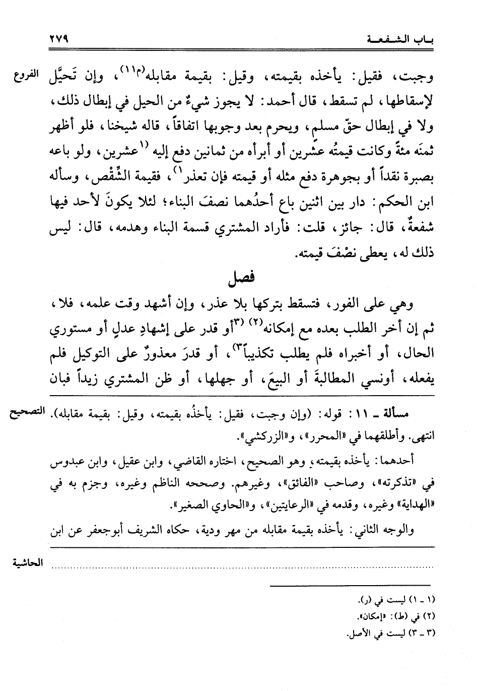 وَجَبَتْ، فَقِيلَ: يَأْخُذُهُ بِقِيمَتِهِ، وَقِيلَ: بِقِيمَةِ مُقَابِلِهِ "م 11"، وَإِنْ تَحَيَّلَ لِإِسْقَاطِهَا لَمْ تَسْقُطْ، قَالَ أَحْمَدُ: لَا يَجُوزُ شَيْءٌ مِنْ الْحِيَلِ فِي إبطال ذلك ولا في إبطال حَقِّ مُسْلِمٍ، وَيَحْرُمُ بَعْدَ وُجُوبِهَا اتِّفَاقًا، قَالَهُ شَيْخُنَا، فَلَوْ أَظْهَرَ ثَمَنَهُ مِائَةً وَكَانَتْ قِيمَتُهُ عِشْرِينَ أَوْ أَبْرَأهُ مِنْ ثَمَانِينَ دَفَعَ إلَيْهِ "1عِشْرِينَ، وَلَوْ بَاعَهُ بِصُبْرَةٍ نَقْدًا وَبِجَوْهَرَةٍ دَفَعَ مِثْلَهُ أَوْ قِيمَتَهُ، فَإِنْ تَعَذَّرَ1" فَقِيمَةُ الشِّقْصِ، وَسَأَلَهُ ابْنُ الْحَكَمِ: دَارٌ بَيْنَ اثْنَيْنِ بَاعَ أَحَدُهُمَا نِصْفَ الْبِنَاءِ لِئَلَّا يَكُونَ لِأَحَدٍ فِيهَا شُفْعَةٌ، قَالَ: جَائِزٌ قُلْت: فَأَرَادَ الْمُشْتَرِي قِسْمَةَ الْبِنَاءِ وَهَدْمَهُ، قَالَ: لَيْسَ ذَلِكَ لَهُ، يُعْطِي نصف قيمته.