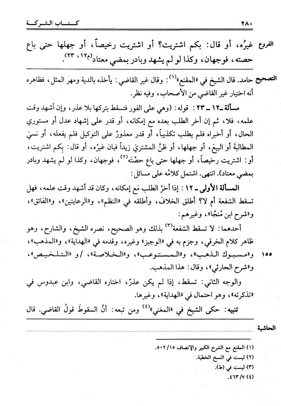 الْمَسْأَلَةُ الْأُولَى-12: إذَا أَخَّرَ الطَّلَبَ مَعَ إمْكَانِهِ وَكَانَ قَدْ أَشْهَدَ وَقْتَ عِلْمِهِ فَهَلْ تَسْقُطُ الشُّفْعَةُ أَمْ لَا؟ أَطْلَقَ الْخِلَافَ، وَأَطْلَقَهُ فِي النَّظْمِ وَالرِّعَايَتَيْنِ وَالْفَائِقِ وَشَرْحِ ابْنِ منجا وَغَيْرِهِمْ: