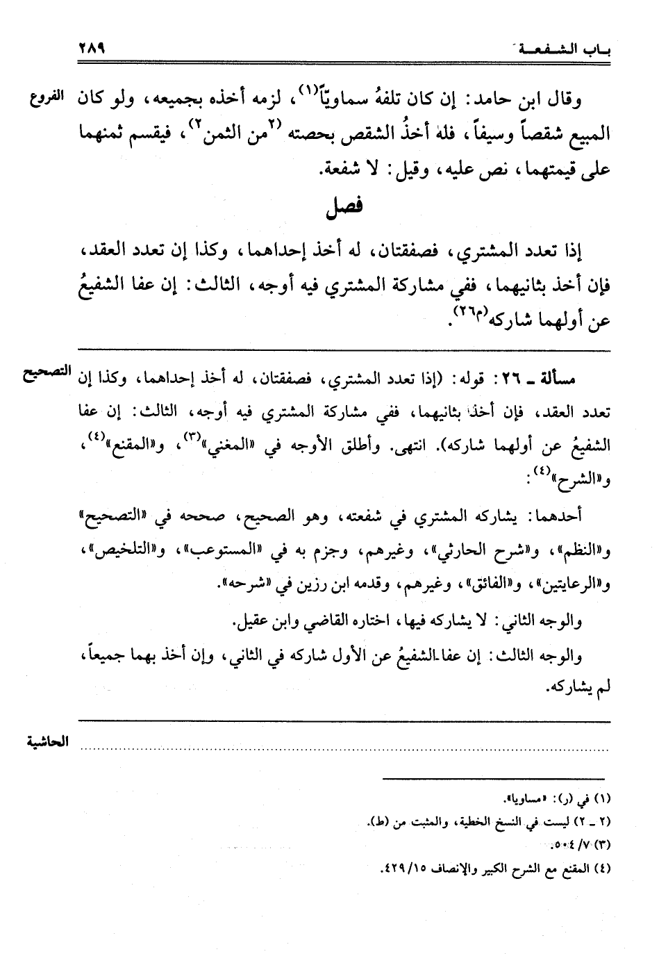 ـــــــــــــــــــــــــــــQمَسْأَلَةٌ-26: قَوْلُهُ: "إذَا تَعَدَّدَ الْمُشْتَرِي فَصَفْقَتَانِ لَهُ أَخْذُ إحْدَاهُمَا، وَكَذَا إنْ تَعَدَّدَ الْعَقْدُ، فَإِنْ أَخَذَ بِثَانِيهِمَا فَفِي مُشَارَكَةِ الْمُشْتَرِي فِيهِ أَوْجُهٌ: الثَّالِثُ: إنْ عَفَا الشَّفِيعُ عَنْ أَوَّلِهِمَا شَارَكَهُ" انْتَهَى، وَأَطْلَقَ الْأَوْجُهَ فِي الْمُغْنِي1 وَالْمُقْنِعِ2 وَالشَّرْحِ2.
