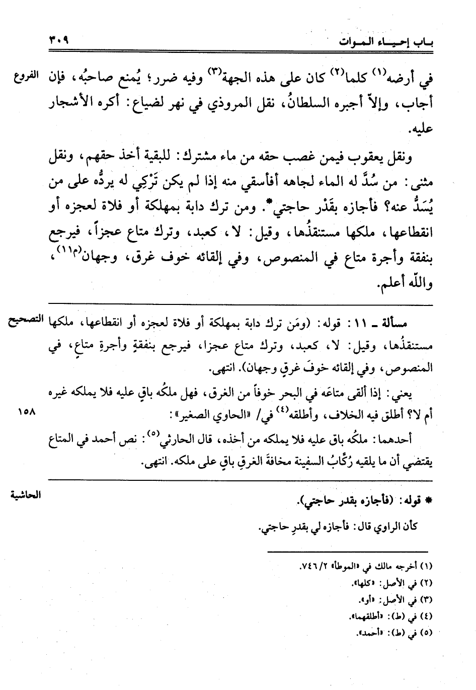 وَنَقَلَ يَعْقُوبُ فِيمَنْ غَصَبَ حَقَّهُ مِنْ مَاءٍ مُشْتَرَكٍ: لِلْبَقِيَّةِ أَخْذُ حَقِّهِمْ، وَنَقَلَ مُثَنَّى: مَنْ سُدَّ لَهُ الْمَاءُ لِجَاهِهِ أَفَأَسْقِي مِنْهُ إذَا لَمْ يَكُنْ تَرْكِي لَهُ يَرُدُّهُ عَلَى مَنْ يَسُدُّ عَنْهُ؟ فَأَجَازَهُ بِقَدْرِ حاجتي. وَمَنْ تَرَكَ دَابَّةً بِمَهْلَكَةٍ أَوْ فَلَاةٍ لِعَجْزِهِ أَوْ انْقِطَاعِهَا مَلَكَهَا مُسْتَنْقِذُهَا: وَقِيلَ، لَا، كَعَبْدٍ، وَتَرْكِ مَتَاعٍ عَجْزًا، فَيَرْجِعُ بِنَفَقَةٍ وَأُجْرَةِ مَتَاعٍ. وَفِي الْمَنْصُوصِ، وَفِي إلْقَائِهِ خَوْفَ غَرَقٍ وَجْهَانِ "م 11" وَاَللَّهُ أَعْلَمُ.