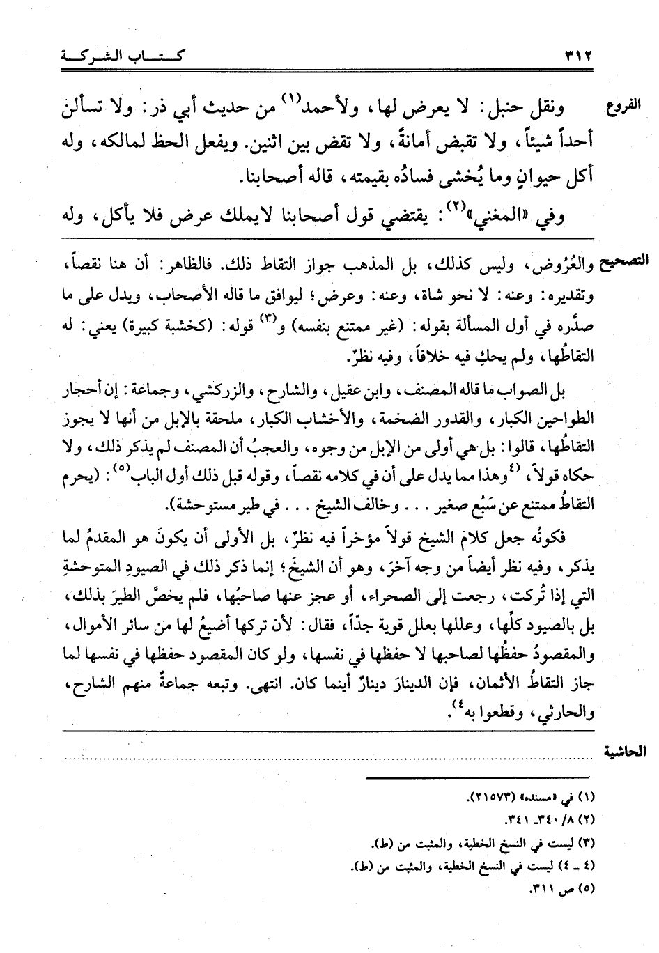 ـــــــــــــــــــــــــــــQوَالْعُرُوضِ، وَلَيْسَ كَذَلِكَ، بَلْ الْمَذْهَبُ جَوَازُ الْتِقَاطِ ذَلِكَ، وَالظَّاهِرُ أَنَّ هُنَا نَقْصًا، وَتَقْدِيرُهُ "وَعَنْهُ: لَا نَحْوُ شَاةٍ، وَعَنْهُ: وَعَرَضٌ" لِيُوَافِقَ مَا قَالَهُ الْأَصْحَابُ، وَيَدُلُّ عَلَى مَا صَدَّرَهُ فِي أول المسألة بقوله: "غير ممتنع بنفسه" و3قوله: "كَخَشَبَةٍ كَبِيرَةٍ" يَعْنِي لَهُ الْتِقَاطُهَا، وَلَمْ يَحْكِ فيه خلافا وفيه نظر.