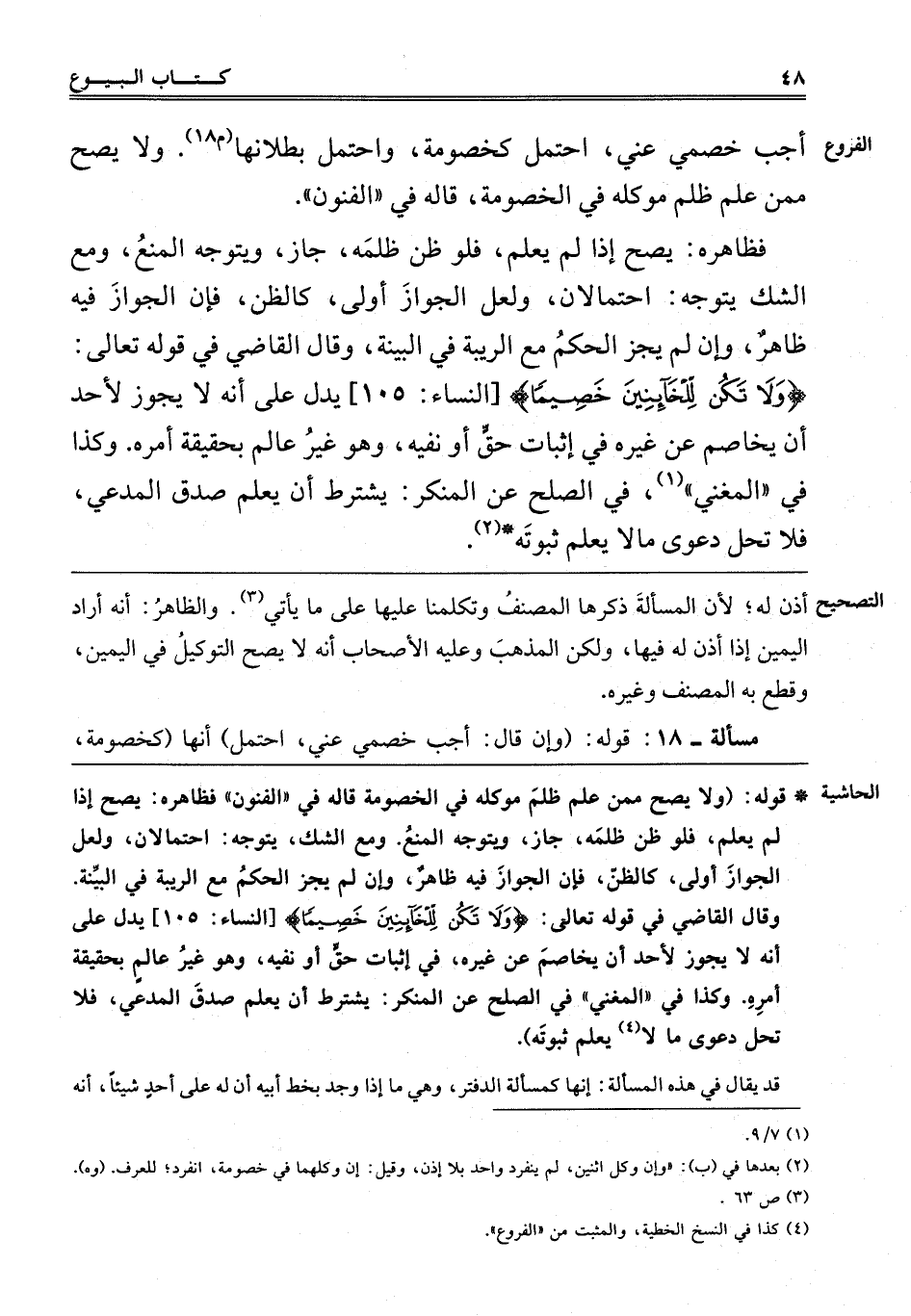 أجب خصمي عَنِّي، اُحْتُمِلَ كَخُصُومَةٍ، وَاحْتُمِلَ بُطْلَانُهَا "م 18" وَلَا يَصِحُّ مِمَّنْ عَلِمَ ظُلْمَ مُوَكِّلِهِ فِي الْخُصُومَةِ، قَالَهُ فِي الْفُنُونِ.