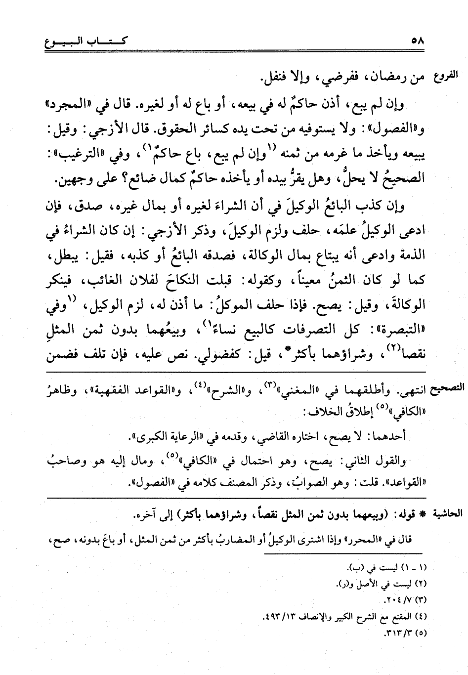 وَإِنْ كَذَّبَ الْبَائِعُ الْوَكِيلَ فِي أَنَّ الشِّرَاءَ لِغَيْرِهِ أَوْ بِمَالِ غَيْرِهِ صُدِّقَ، فَإِنْ ادَّعَى الْوَكِيلُ عِلْمَهُ حَلَفَ وَلَزِمَ الْوَكِيلَ، وَذَكَرَ الْأَزَجِيُّ: إنْ كَانَ الشِّرَاءُ فِي الذِّمَّةِ وَادَّعَى أَنَّهُ يَبْتَاعُ بِمَالِ الْوَكَالَةِ فَصَدَّقَهُ الْبَائِعُ أَوْ كَذَّبَهُ فَقِيلَ: يَبْطُلُ، كَمَا لَوْ كَانَ الثَّمَنُ مُعَيَّنًا، وَكَقَوْلِهِ: قَبِلْت النِّكَاحَ لِفُلَانٍ الْغَائِبِ فَيُنْكِرُ الْوَكَالَةَ، وَقِيلَ: يَصِحُّ، فَإِذَا حَلَفَ الْمُوَكِّلُ: مَا أَذِنَ لَهُ، لَزِمَ الْوَكِيلَ، "1وَفِي التَّبْصِرَةِ: كُلُّ التَّصَرُّفَاتِ كَالْبَيْعِ نَسَاءً1"، وَبَيْعُهُمَا بِدُونِ ثَمَنِ الْمِثْلِ نَقْصًا2 وَشِرَاؤُهُمَا بأكثر قيل: كفضولي، نص عليه، فإن تلف. فضمن