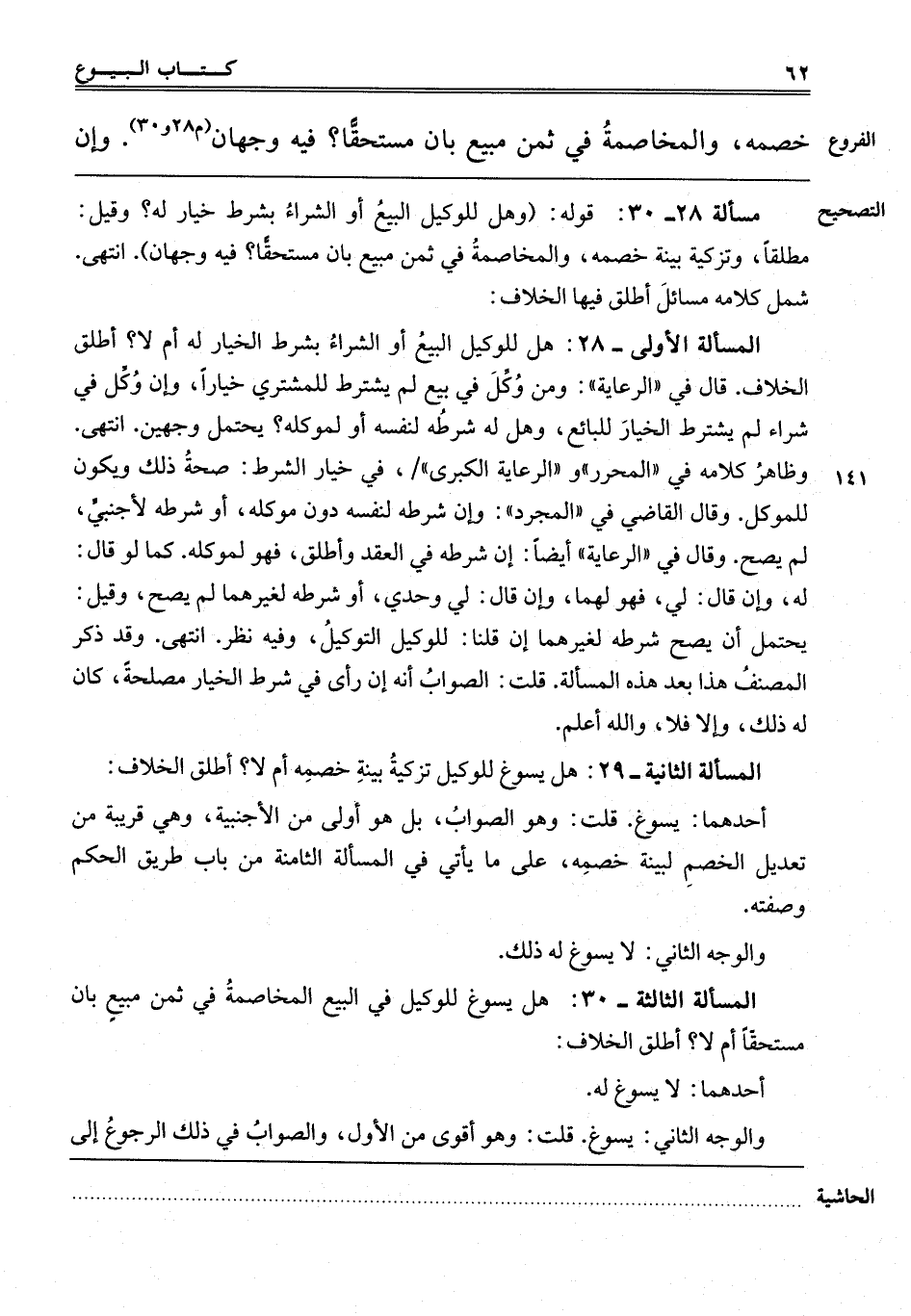الْمَسْأَلَةُ الْأُولَى-28: هَلْ لِلْوَكِيلِ الْبَيْعُ أَوْ الشِّرَاءُ بِشَرْطِ الْخِيَارِ لَهُ أَمْ لَا؟ أَطْلَقَ الْخِلَافَ. قَالَ فِي الرِّعَايَةِ: وَمَنْ وُكِّلَ فِي بَيْعٍ لَمْ يَشْتَرِطْ لِلْمُشْتَرِي خِيَارًا، وَإِنْ وُكِّلَ فِي شِرَاءِ لَمْ يَشْتَرِطْ الْخِيَارَ لِلْبَائِعِ، وَهَلْ لَهُ شَرْطُهُ لِنَفْسِهِ أَوْ لِمُوَكِّلِهِ؟ يَحْتَمِلُ وَجْهَيْنِ انْتَهَى وَظَاهِرُ كَلَامِهِ فِي الْمُحَرَّرِ وَالرِّعَايَةِ الْكُبْرَى: فِي خِيَارِ الشَّرْطِ صِحَّةُ ذَلِكَ وَيَكُونُ لِلْمُوَكِّلِ. وَقَالَ الْقَاضِي فِي الْمُجَرَّدِ: وَإِنْ شَرَطَهُ لِنَفْسِهِ دُونَ مُوَكِّلِهِ أَوْ شَرَطَهُ لِأَجْنَبِيٍّ لَمْ يَصِحَّ. وَقَالَ فِي الرِّعَايَةِ أَيْضًا: إنْ شَرَطَهُ فِي الْعَقْدِ وَأَطْلَقَ فَهُوَ لِمُوَكِّلِهِ، كَمَا لَوْ قَالَ: لَهُ، وَإِنْ قَالَ: لِي، فَهُوَ لَهُمَا، وَإِنْ قَالَ: لِي وَحْدِي، أَوْ شَرَطَهُ لِغَيْرِهِمَا؟ لَمْ يَصِحَّ، وَقِيلَ: يَحْتَمِلُ أَنْ يَصِحَّ شَرْطُهُ لِغَيْرِهِمَا إنْ قُلْنَا لِلْوَكِيلِ التَّوْكِيلُ. وَفِيهِ نَظَرٌ انْتَهَى. وَقَدْ ذَكَرَ الْمُصَنِّفُ هَذَا بَعْدَ هَذِهِ الْمَسْأَلَةِ قُلْت: الصَّوَابُ أَنَّهُ إنْ رَأَى فِي شَرْطِهِ الْخِيَارَ مَصْلَحَةً كَانَ لَهُ ذَلِكَ، وَإِلَّا فَلَا، وَاَللَّهُ أَعْلَمُ.