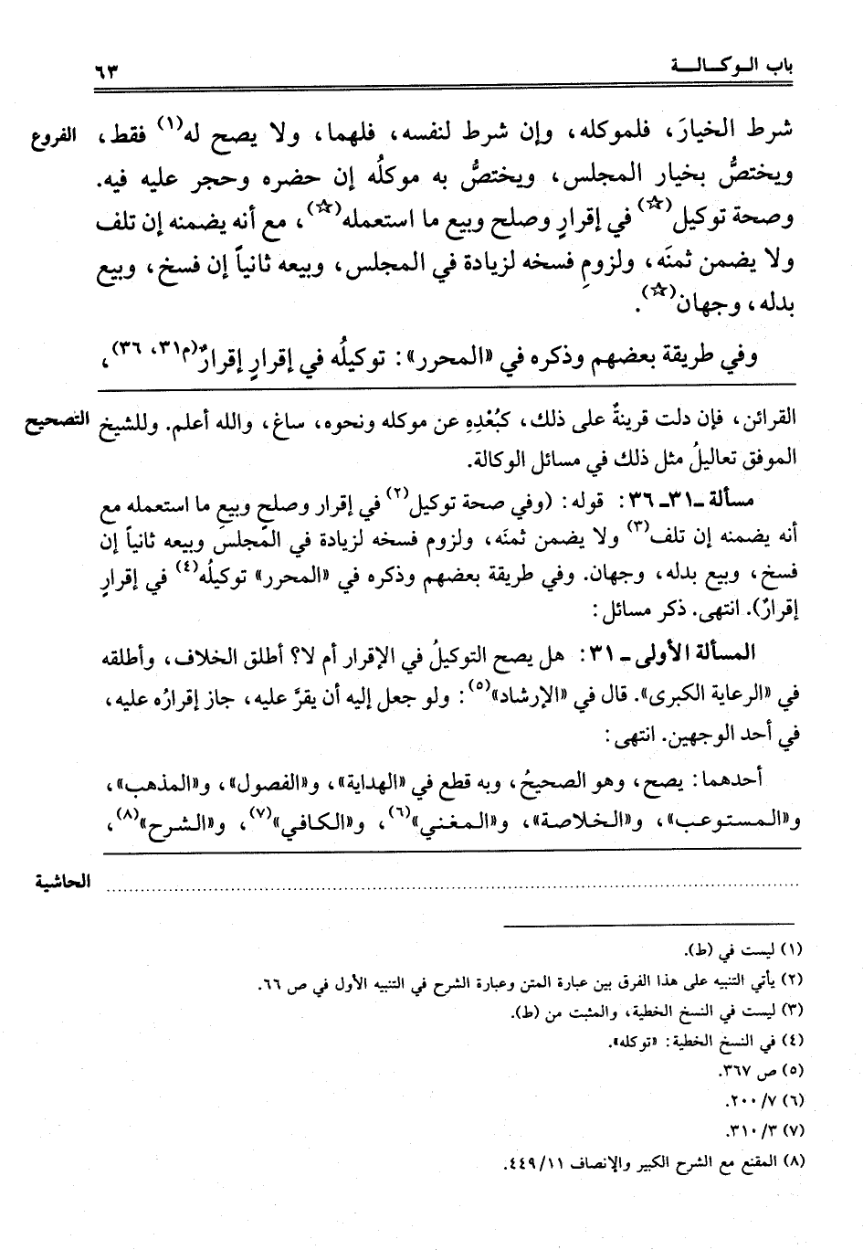 الْمَسْأَلَةُ الْأُولَى-31: هَلْ يَصِحُّ التَّوْكِيلُ فِي الْإِقْرَارِ أَمْ لَا؟ أُطْلِقَ الْخِلَافُ، وَأَطْلَقَهُ فِي الرِّعَايَةِ الْكُبْرَى. قَالَ فِي الْإِرْشَادِ5 وَلَوْ جَعَلَ إلَيْهِ أَنْ يُقِرَّ عَلَيْهِ جَازَ إقْرَارُهُ عَلَيْهِ، فِي أَحَدِ الْوَجْهَيْنِ" انْتَهَى: