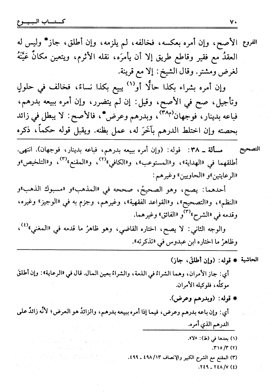 ـــــــــــــــــــــــــــــQمَسْأَلَةٌ-38: قَوْلُهُ: "وَإِنْ أَمَرَهُ بِبَيْعِهِ بِدِرْهَمٍ فَبَاعَهُ بِدِينَارٍ فَوَجْهَانِ" انْتَهَى. وَأَطْلَقَهُمَا فِي الْهِدَايَةِ وَالْمُسْتَوْعِبِ وَالْكَافِي2 وَالْمُقْنِعِ3 وَالتَّلْخِيصِ وَالرِّعَايَتَيْنِ وَالْحَاوِيَيْنِ وَغَيْرِهِمْ:
