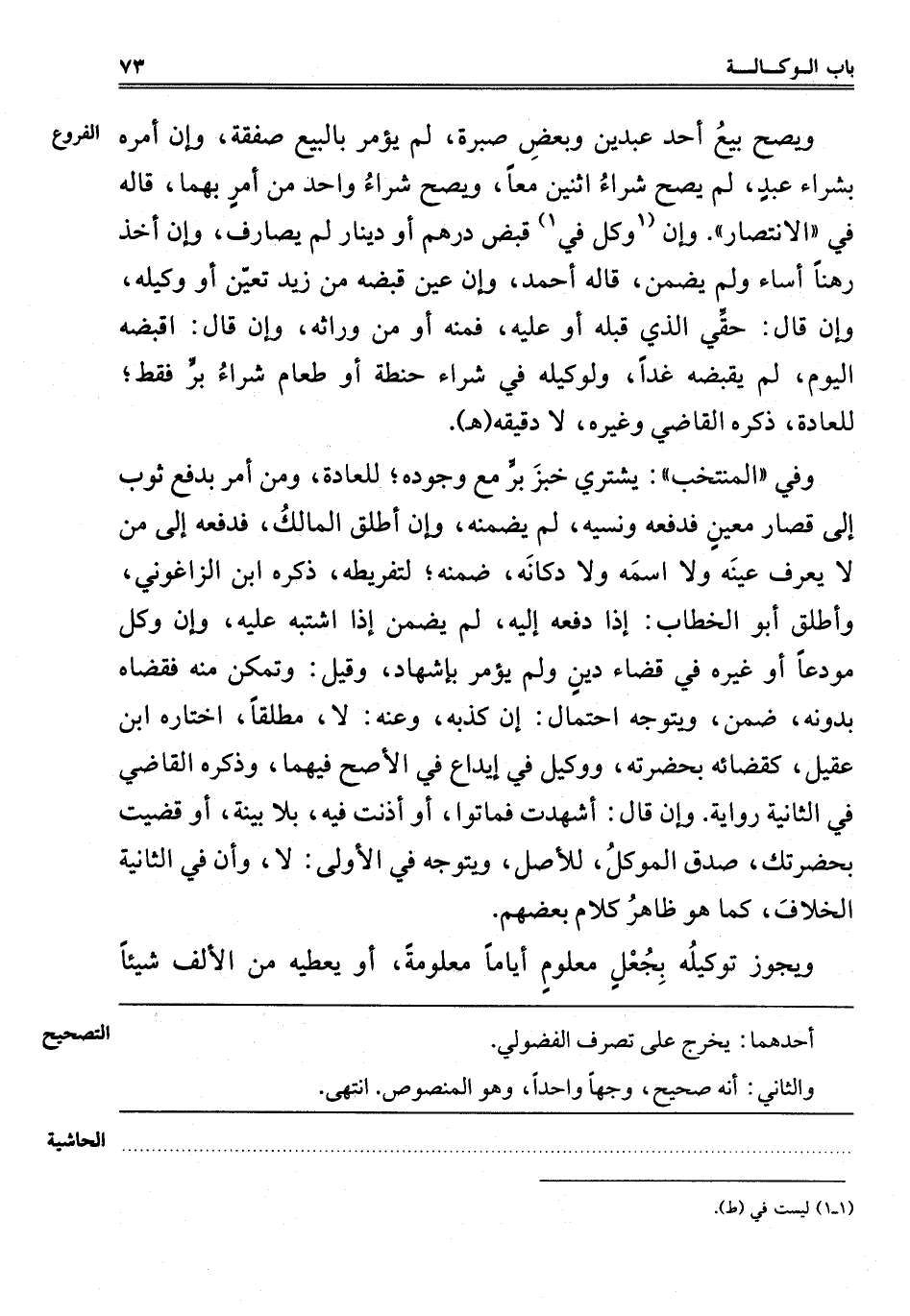 وَيَصِحُّ بَيْعُ أَحَدِ عَبْدَيْنِ وَبَعْضُ صُبْرَةٍ لَمْ يُؤْمَرْ بِالْبَيْعِ صَفْقَةً، وَإِنْ أَمَرَهُ بِشِرَاءِ عَبْدٍ لَمْ يَصِحَّ شِرَاءُ اثْنَيْنِ مَعًا، وَيَصِحُّ شِرَاءُ وَاحِدٍ مِمَّنْ أُمِرَ بِهِمَا، قَالَهُ فِي الِانْتِصَارِ "1وَإِنْ وَكَّلَ فِي1" قَبْضِ دِرْهَمٍ أَوْ دِينَارٍ لَمْ يُصَارَفْ، وَإِنْ أَخَذَ رَهْنًا أَسَاءَ وَلَمْ يَضْمَنْهُ، قَالَهُ أَحْمَدُ، وَإِنْ عَيَّنَ قَبْضَهُ مِنْ زَيْدٍ تَعَيَّنَ أَوْ وَكِيلُهُ، وَإِنْ قَالَ حَقِّي الَّذِي قِبَلَهُ أَوْ عَلَيْهِ فَمِنْهُ أَوْ مِنْ وَارِثِهِ، وَإِنْ قَالَ اقْبِضْهُ الْيَوْمَ لَمْ يَقْبِضْهُ غَدًا، وَلِوَكِيلِهِ فِي شِرَاءِ حِنْطَةٍ أَوْ طَعَامٍ شِرَاءُ بُرٍّ فَقَطْ، لِلْعَادَةِ، ذَكَرَهُ الْقَاضِي وَغَيْرُهُ، لا دقيقه "هـ".