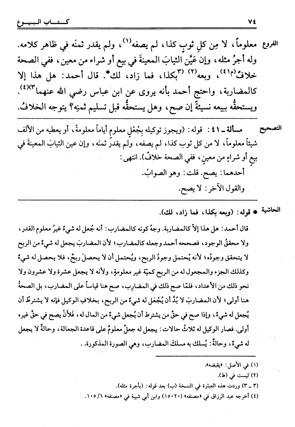 مَعْلُومًا، لَا مِنْ كُلِّ ثَوْبٍ كَذَا لَمْ يَصِفْهُ1 وَلَمْ يُقَدِّرْ ثَمَنَهُ، فِي ظَاهِرِ كَلَامِهِ، وَلَهُ أَجْرُ مِثْلِهِ وَإِنْ عَيَّنَ الثِّيَابَ الْمُعَيَّنَةَ فِي بَيْعٍ أَوْ شِرَاءٍ مِنْ مُعَيَّنٍ فَفِي الصحة خلاف "م 41" وبعه2 "3بكذا فَمَا زَادَ لَك، قَالَ أَحْمَدُ: هَلْ هَذَا إلَّا كَالْمُضَارَبَةِ، وَاحْتَجَّ أَحْمَدُ بِأَنَّهُ يُرْوَى عَنْ ابْنِ عَبَّاسٍ رَضِيَ اللَّهُ عَنْهُمَا3"4 وَيَسْتَحِقُّهُ بِبَيْعِهِ نَسِيئَةً إنْ صَحَّ، وَهَلْ يَسْتَحِقُّهُ قَبْلَ تَسْلِيمِ ثمنه؟ يتوجه الخلاف.