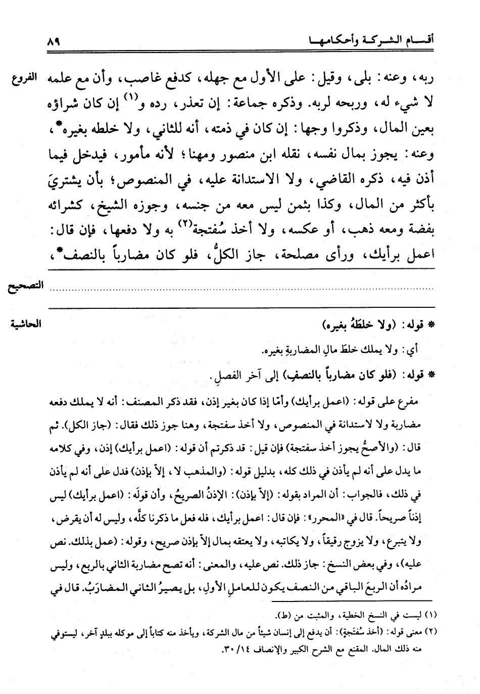 2 معنى قوله: "أخذ سفتجة": أن يدفع إلى إنسان شيئاً من مال الشركة، ويأخذ منه كتاباً إلى موكله ببلد آخر، ليستوفي منه ذلك المال. المقنع مع الشرح الكبير والإنصاف 14/30.