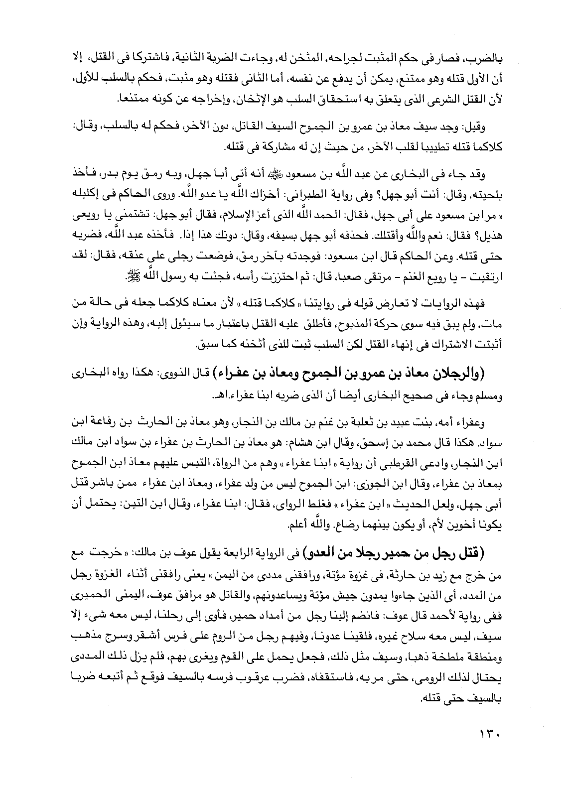 فهذه الروايات لا تعارض قوله في روايتنا "كلاكما قتله" لأن معناه كلاكما جعله في حالة من مات ولم يبق فيه سوى حركة المذبوح فأطلق عليه القتل باعتبار ما سيئول إليه وهذه الرواية وإن أثبتت الاشتراك في إنهاء القتل لكن السلب ثبت للذي أثخنه كما سبق.