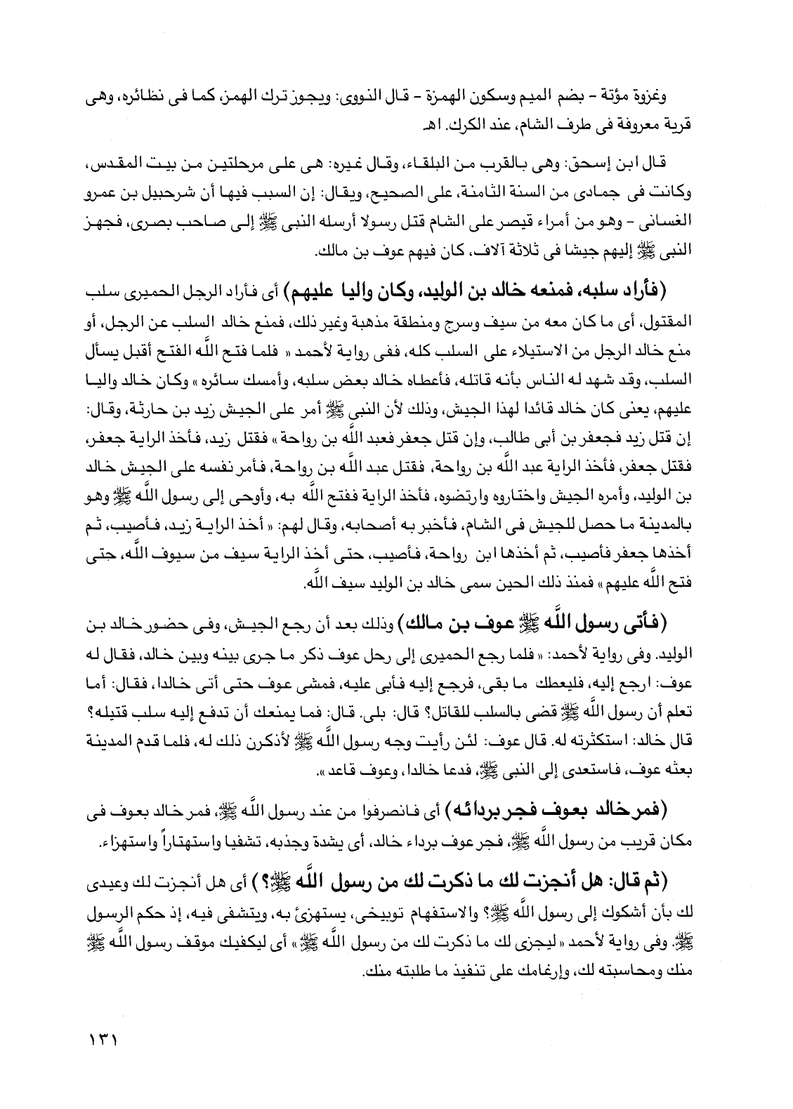 (فأتى رسول الله صلى الله عليه وسلم عوف بن مالك) وذلك بعد أن رجع الجيش وفي حضور خالد بن الوليد وفي رواية لأحمد: "فلما رجع الحميري إلى رحل عوف ذكر ما جرى بينه وبين خالد فقال له عوف: ارجع إليه فليعطك ما بقي فرجع إليه فأبى عليه فمشى عوف حتى أتى خالدا فقال: أما تعلم أن رسول الله صلى الله عليه وسلم قضى بالسلب للقاتل؟ قال: بلى. قال: فما يمنعك أن تدفع إليه سلب قتيله؟ قال خالد: استكثرته له. قال عوف: لئن رأيت وجه رسول الله صلى الله عليه وسلم لأذكرن ذلك له فلما قدم المدينة بعثه عوف فاستعدى إلى النبي صلى الله عليه وسلم فدعا خالدا وعوف قاعد".