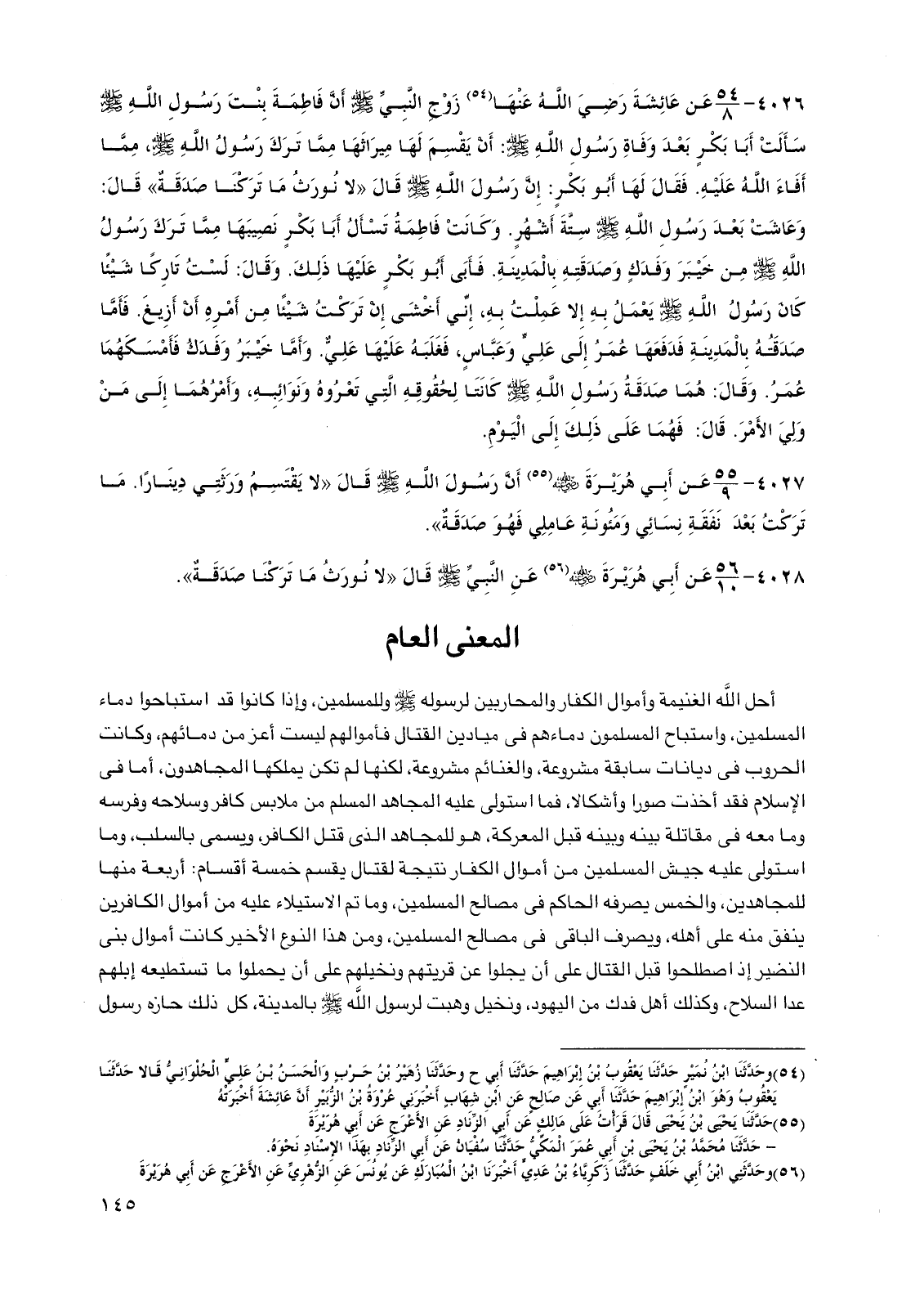 4026 - عن عائشة رضي الله عنها زوج النبي صلى الله عليه وسلم أن فاطمة بنت رسول الله صلى الله عليه وسلم سألت أبا بكر بعد وفاة رسول الله صلى الله عليه وسلم: أن يقسم لها ميراثها مما ترك رسول الله صلى الله عليه وسلم مما أفاء الله عليه. فقال لها أبو بكر: إن رسول الله صلى الله عليه وسلم قال "لا نورث ما تركنا صدقة" قال: وعاشت بعد رسول الله صلى الله عليه وسلم ستة أشهر. وكانت فاطمة تسأل أبا بكر نصيبها مما ترك رسول الله صلى الله عليه وسلم من خيبر وفدك وصدقته بالمدينة. فأبى أبو بكر عليها ذلك. وقال: لست تاركا شيئا كان رسول الله صلى الله عليه وسلم يعمل به إلا عملت به إني أخشى إن تركت شيئا من أمره أن أزيغ فأما صدقته بالمدينة فدفعها عمر إلى علي وعباس فغلبه عليها علي. وأما خيبر وفدك فأمسكهما عمر. وقال: هما صدقة رسول الله صلى الله عليه وسلم كانتا لحقوقه التي تعروه ونوائبه وأمرهما إلى من ولي الأمر. قال: فهما على ذلك إلى اليوم.