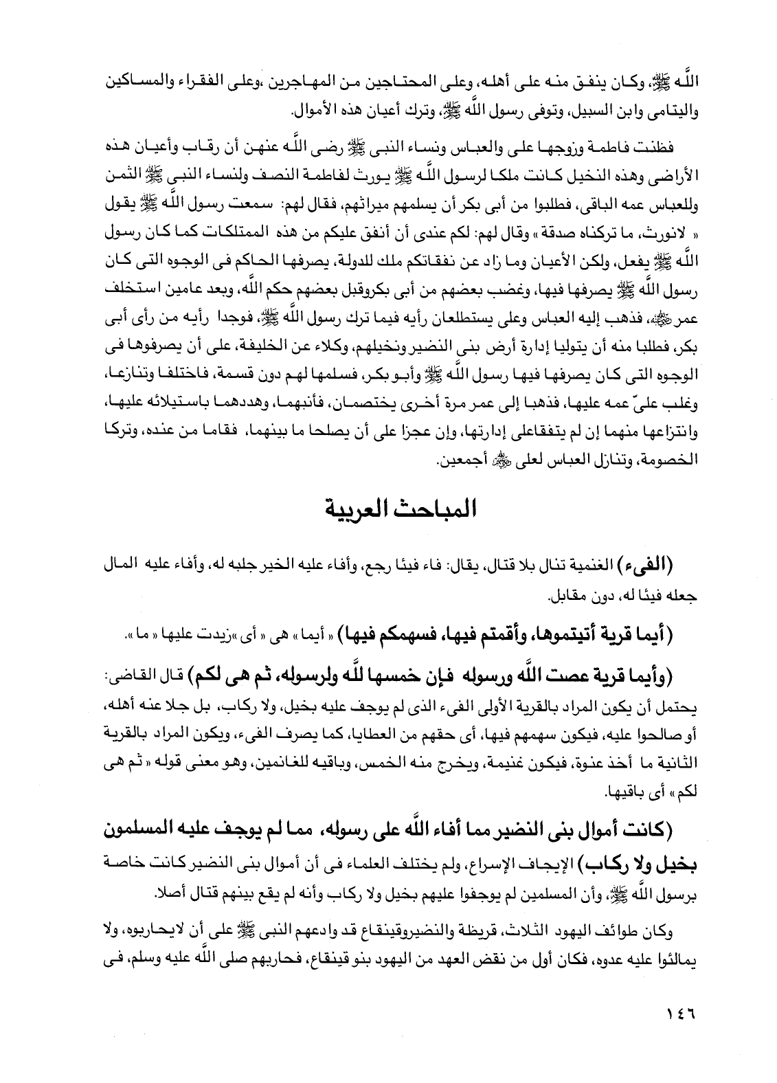 الله صلى الله عليه وسلم وكان ينفق منه على أهله وعلى المحتاجين من المهاجرين وعلى الفقراء والمساكين واليتامى وابن السبيل وتوفى رسول الله صلى الله عليه وسلم وترك أعيان هذه الأموال.