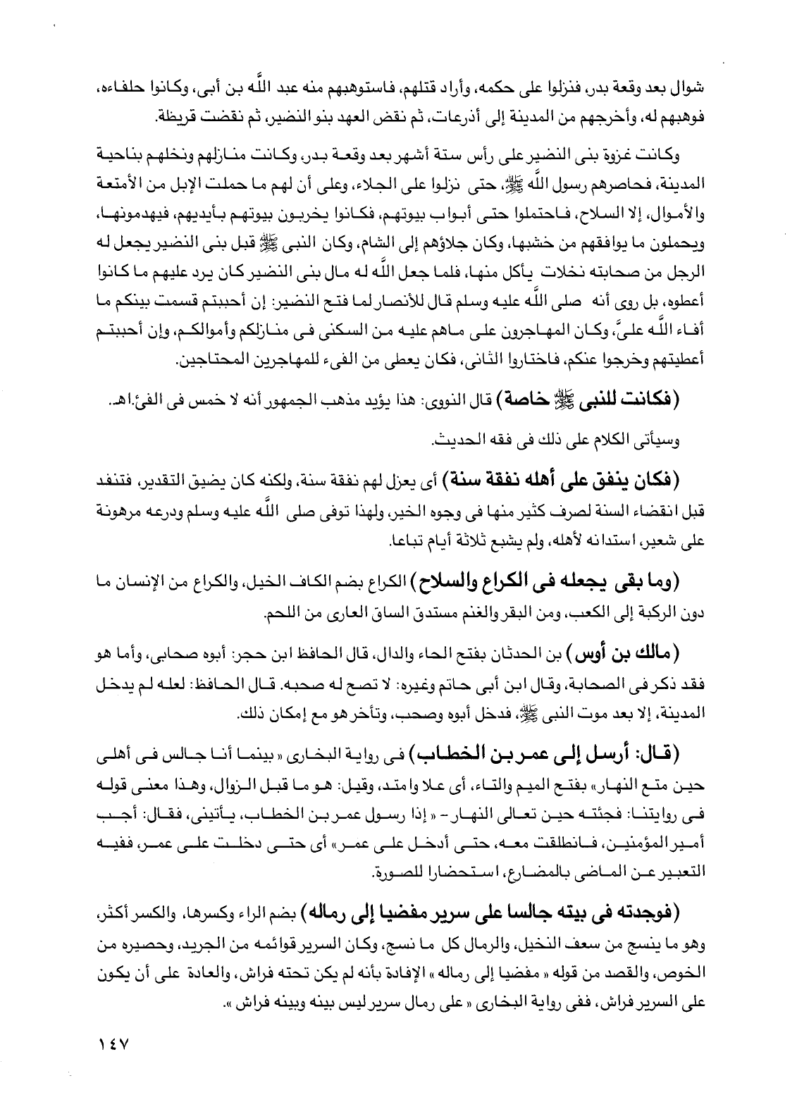 (فكان ينفق على أهله نفقة سنة) أي يعزل لهم نفقة سنة ولكنه كان يضيق التقدير فتنفد قبل انقضاء السنة لصرف كثير منها في وجوه الخير ولهذا توفى صلى الله عليه وسلم ودرعه مرهونة على شعير استدانه لأهله ولم يشبع ثلاثة أيام تباعا.