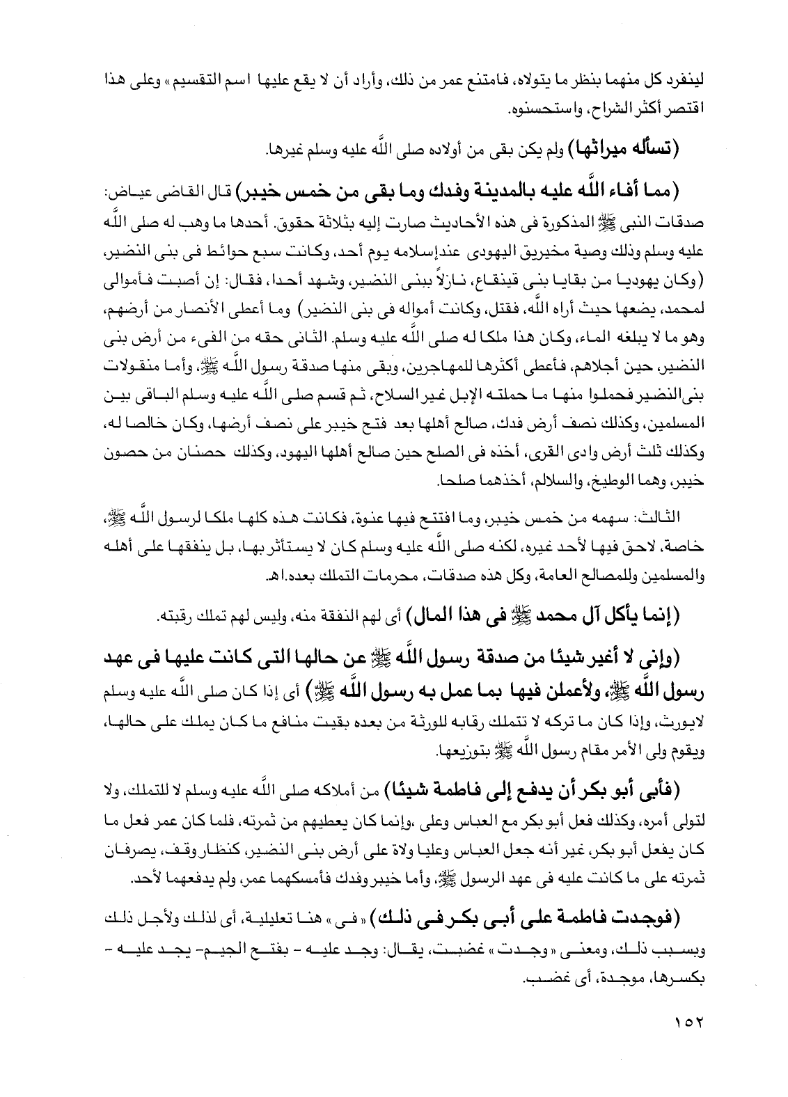(فأبى أبو بكر أن يدفع إلى فاطمة شيئا) من أملاكه صلى الله عليه وسلم لا للتملك ولا لتولي أمره وكذلك فعل أبو بكر مع العباس وعلي وإنما كان يعطيهم من ثمرته فلما كان عمر فعل ما كان يفعل أبو بكر غير أنه جعل العباس وعليا ولاة على أرض بني النضير كنظار وقف يصرفان ثمرته على ما كانت عليه في عهد الرسول صلى الله عليه وسلم وأما خيبر وفدك فأمسكهما عمر ولم يدفعهما لأحد.