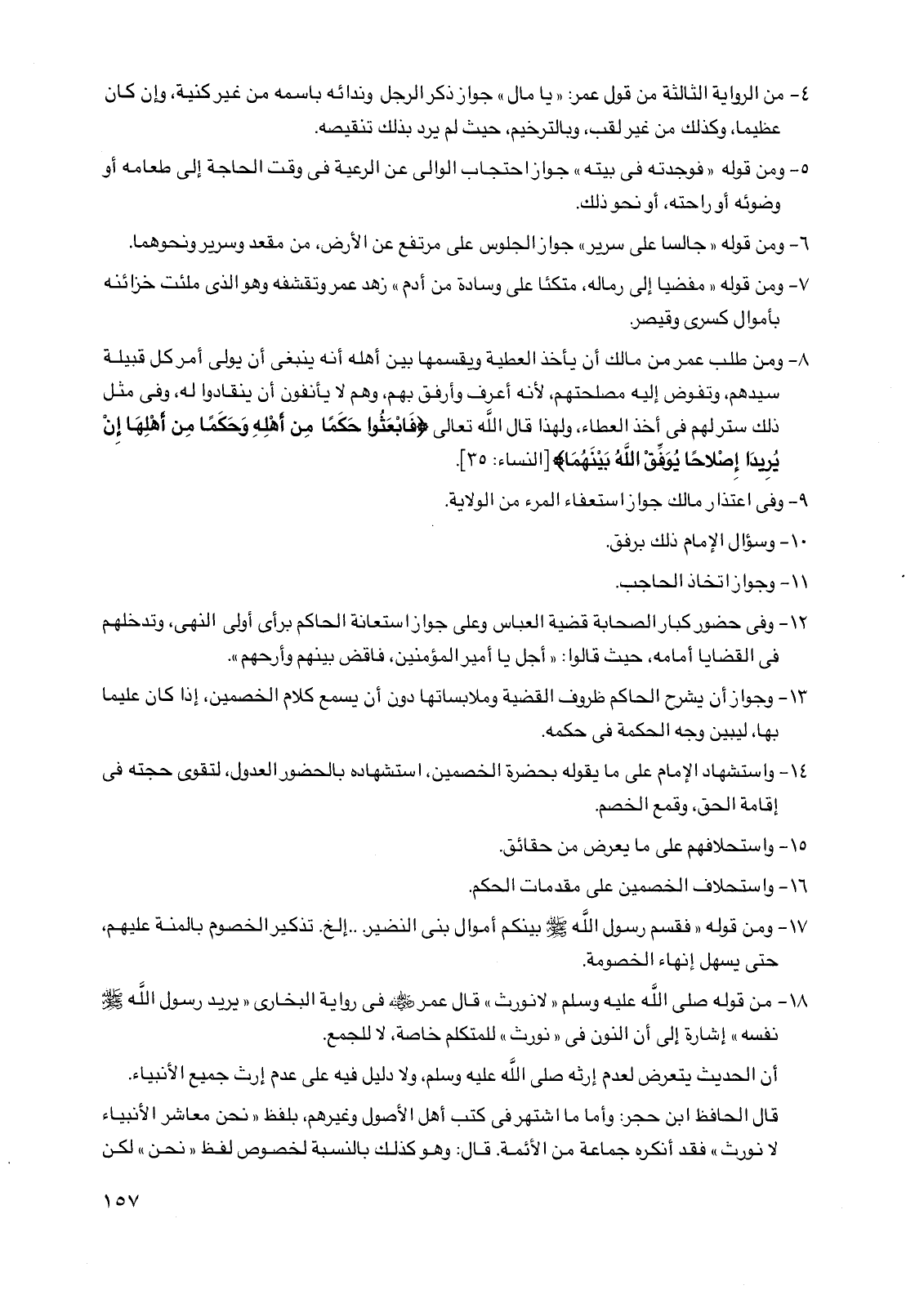 12 - وفي حضور كبار الصحابة قضية العباس وعلي جواز استعانة الحاكم برأي أولي النهي وتدخلهم في القضايا أمامه حيث قالوا: "أجل يا أمير المؤمنين فاقض بينهم وأرحهم".