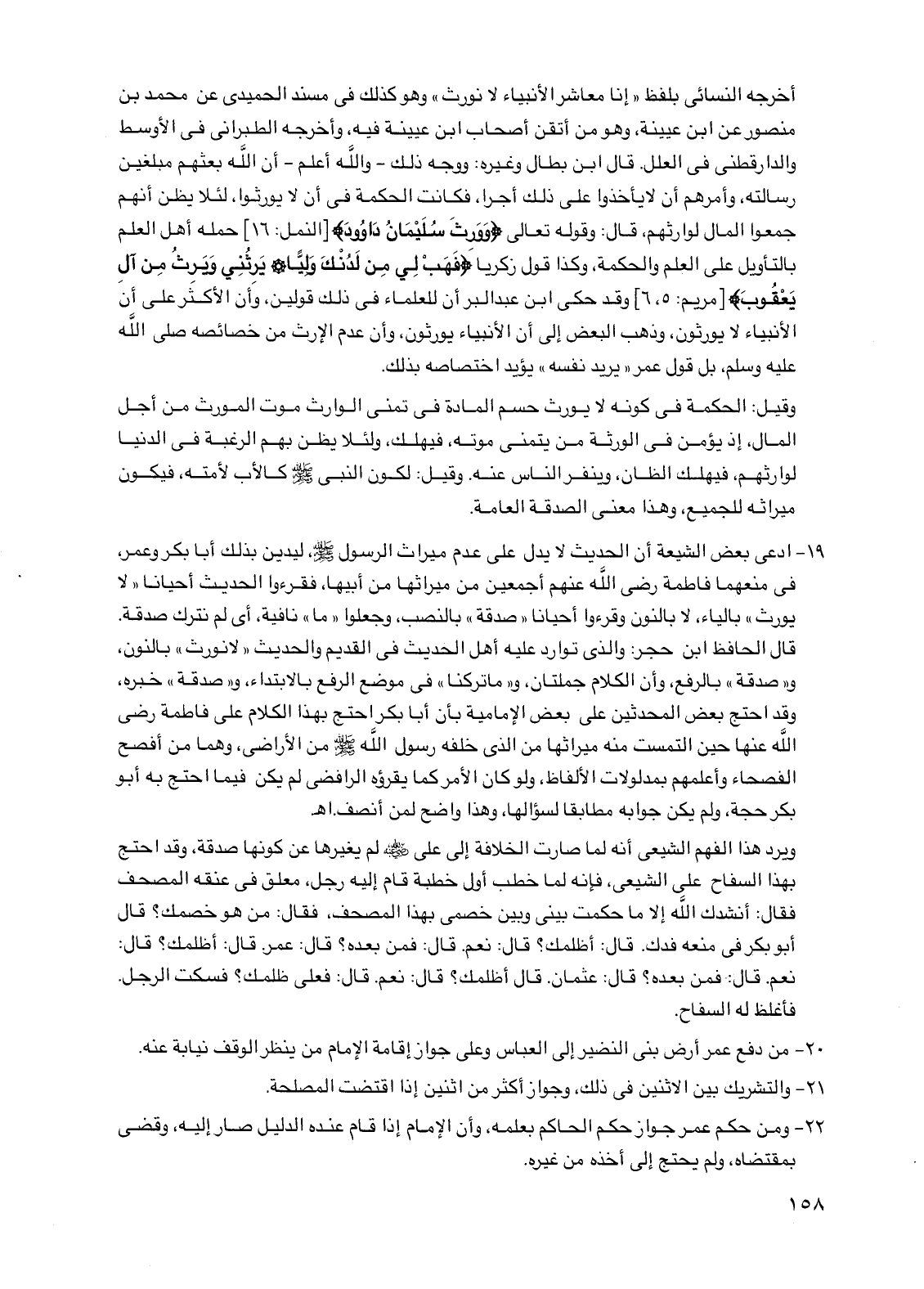 19 - ادعى بعض الشيعة أن الحديث لا يدل على عدم ميراث الرسول صلى الله عليه وسلم ليدين بذلك أبا بكر وعمر في منعهما فاطمة رضي الله عنهم أجمعين من ميراثها من أبيها فقرءوا الحديث أحيانا "لا يورث" بالياء لا بالنون وقرءوا أحيانا "صدقة" بالنصب وجعلوا "ما" نافية أي لم نترك صدقة قال الحافظ ابن حجر: والذي توارد عليه أهل الحديث في القديم والحديث "لا نورث" بالنون و"صدقة" بالرفع وأن الكلام جملتان و"ما تركنا" في موضع الرفع بالابتداء و"صدقة" خبره وقد احتج بعض المحدثين على بعض الإمامية بأن أبا بكر احتج بهذا الكلام على فاطمة رضي الله عنها حين التمست منه ميراثها من الذي خلفه رسول الله صلى الله عليه وسلم من الأراضي وهما من أفصح الفصحاء وأعلمهم بمدلولات الألفاظ ولو كان الأمر كما يقرؤه الرافضي لم يكن فيما احتج به أبو بكر حجة ولم يكن جوابه مطابقا لسؤالها وهذا واضح لمن أنصف. اهـ.