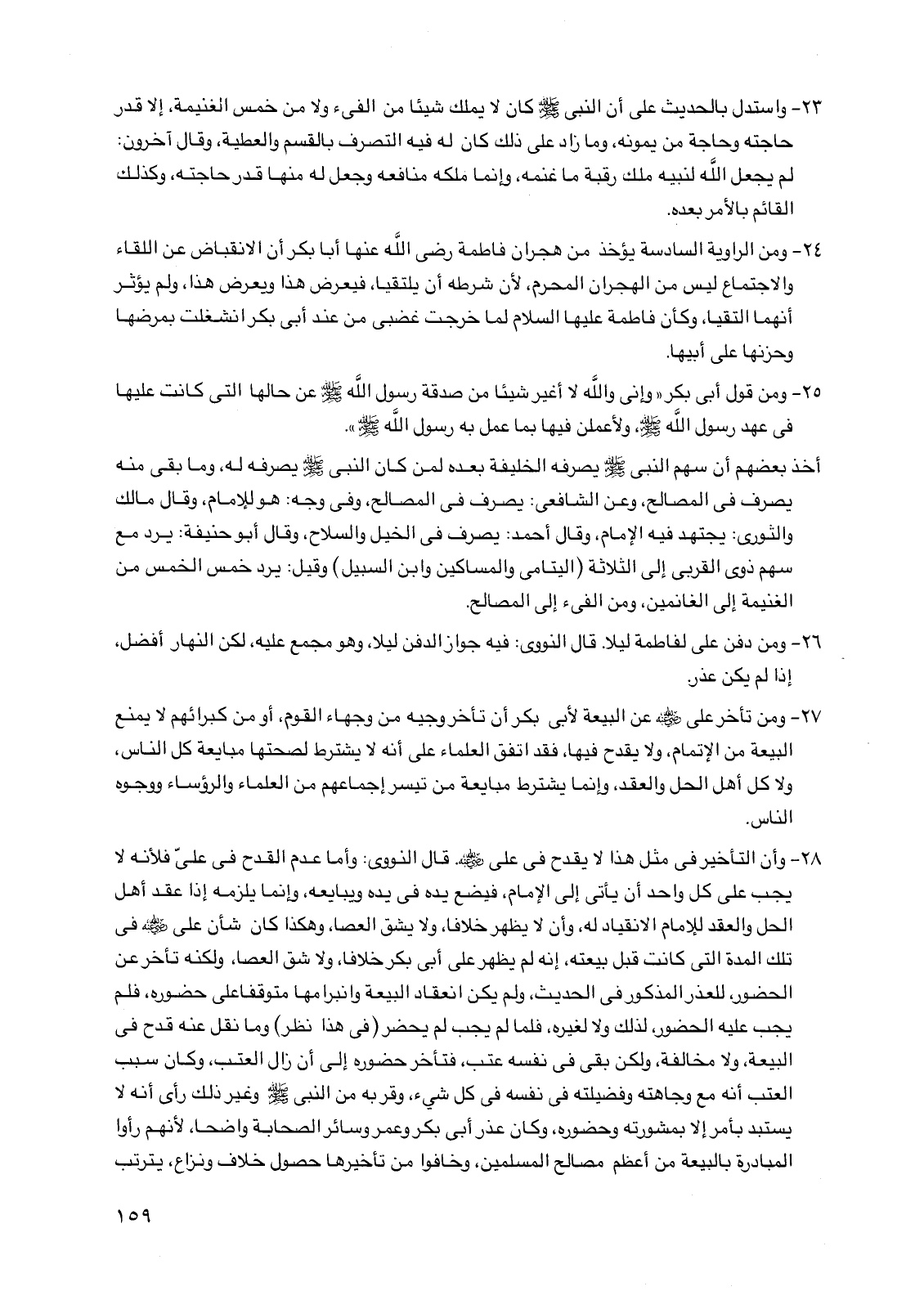 27 - ومن تأخر علي رضي الله عنه عن البيعة لأبي بكر أن تأخر وجيه من وجهاء القوم أو من كبرائهم لا يمنع البيعة من الإتمام ولا يقدح فيها فقد اتفق العلماء على أنه لا يشترط لصحتها مبايعة كل الناس ولا كل أهل الحل والعقد وإنما يشترط مبايعة من تيسر إجماعهم من العلماء والرؤساء ووجوه الناس.