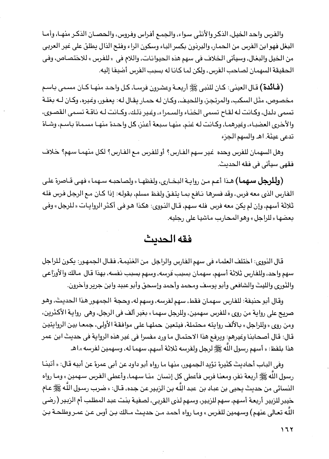 وقال أبو حنيفة: للفارس سهمان فقط سهم لفرسه وسهم له وحجة الجمهور هذا الحديث وهو صريح على رواية من روي "للفرس سهمين وللرجل سهما" بغير ألف في الرجل وهي رواية الأكثرين ومن روي "وللراجل" بالألف روايته محتملة فيتعين حملها على موافقة الأولى جمعا بين الروايتين قال: قال أصحابنا وغيرهم: ويرفع هذا الاحتمال ما ورد مفسرا في غير هذه الرواية في حديث ابن عمر هذا بلفظ: "أسهم رسول الله صلى الله عليه وسلم لرجل ولفرسه ثلاثة أسهم سهما له وسهمين لفرسه" اهـ.