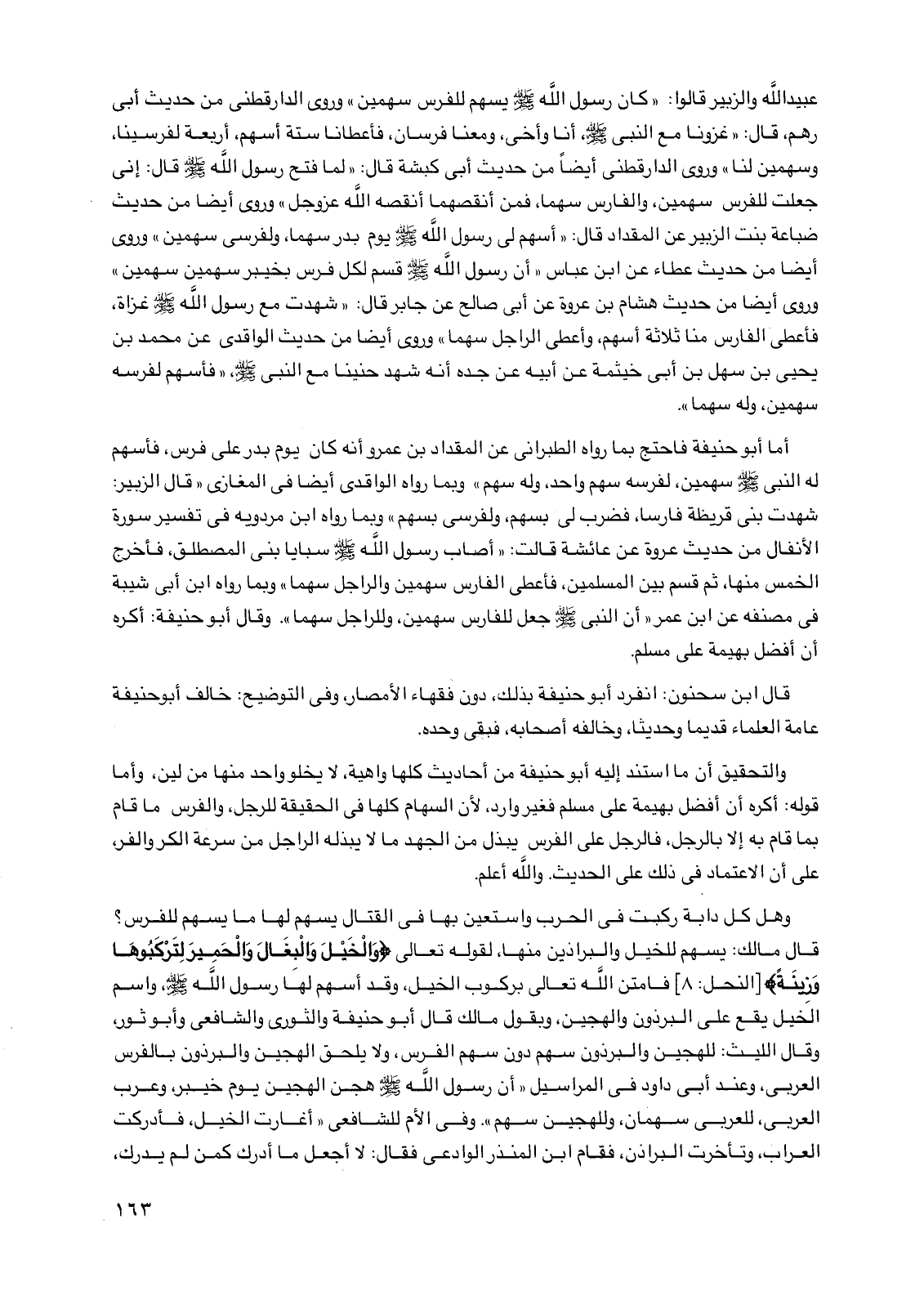 عبيد الله والزبير قالوا: "كان رسول الله صلى الله عليه وسلم يسهم للفرس سهمين" وروى الدارقطني من حديث أبي رهم قال: "غزونا مع النبي صلى الله عليه وسلم أنا وأخي ومعنا فرسان فأعطانا ستة أسهم أربعة لفرسينا وسهمين لنا" وروى الدارقطني أيضا من حديث أبي كبشة قال: "لما فتح رسول الله صلى الله عليه وسلم قال: إني جعلت للفرس سهمين والفارس سهما فمن أنقصهما أنقصه الله عز وجل" وروي أيضا من حديث ضباعة بنت الزبير عن المقداد قال: "أسهم لي رسول الله صلى الله عليه وسلم يوم بدر سهما ولفرسي سهمين" وروي أيضا من حديث عطاء عن ابن عباس "أن رسول الله صلى الله عليه وسلم قسم لكل فرس بخيبر سهمين سهمين" وروي أيضا من حديث هشام بن عروة عن أبي صالح عن جابر قال: "شهدت مع رسول الله صلى الله عليه وسلم غزاة فأعطى الفارس منا ثلاثة أسهم وأعطى الراجل سهما" وروي أيضا من حديث الواقدي عن محمد بن يحيى بن سهل بن أبي خيثمة عن أبيه عن جده أنه شهد حنينا مع النبي صلى الله عليه وسلم "فأسهم لفرسه سهمين وله سهما".