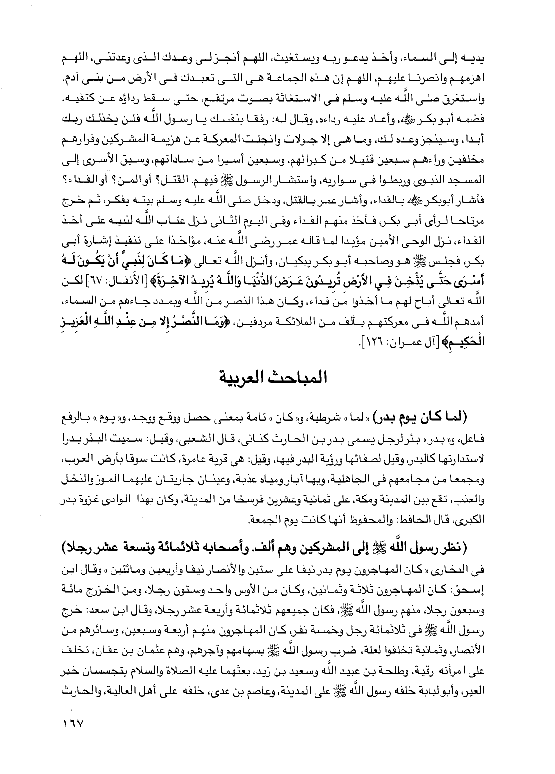 يديه إلى السماء وأخذ يدعو ربه ويستغيث اللهم أنجز لي وعدك الذي وعدتني اللهم اهزمهم وانصرنا عليهم اللهم إن هذه الجماعة هي التي تعبدك في الأرض من بني آدم واستغرق صلى الله عليه وسلم في الاستغاثة بصوت مرتفع حتى سقط رداؤه عن كتفيه فضمه أبو بكر رضي الله عنه وأعاد عليه رداءه وقال له: رفقا بنفسك يا رسول الله فلن يخذلك ربك أبدا وسينجز وعده لك وما هي إلا جولات وانجلت المعركة عن هزيمة المشركين وفرارهم مخلفين وراءهم سبعين قتيلا من كبرائهم وسبعين أسيرا من ساداتهم وسيق الأسرى إلى المسجد النبوي وربطوا في سواريه واستشار الرسول صلى الله عليه وسلم فيهم القتل؟ أو المن؟ أو الفداء؟ فأشار أبو بكر رضي الله عنه بالفداء وأشار عمر بالقتل ودخل صلى الله عليه وسلم بيته يفكر ثم خرج مرتاحا لرأي أبي بكر فأخذ منهم الفداء وفي اليوم الثاني نزل عتاب الله لنبيه على أخذ الفداء نزل الوحي الأمين مؤيدا لما قاله عمر رضي