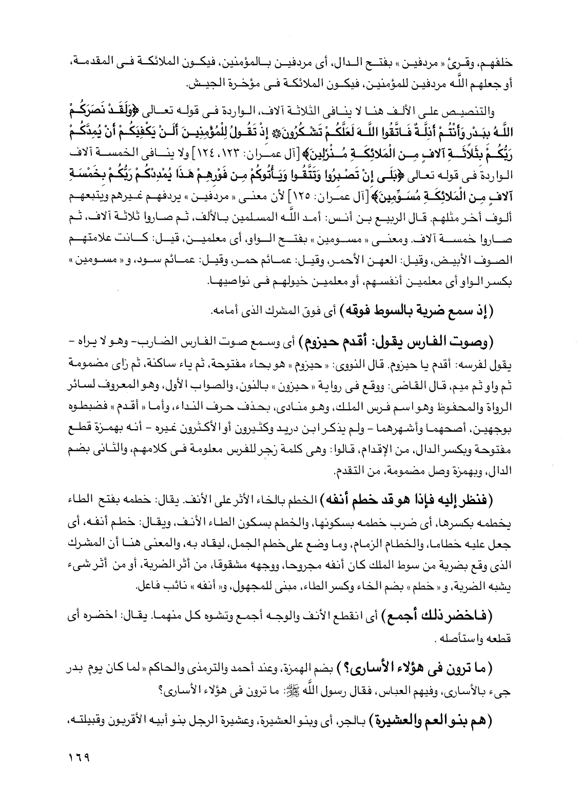 (وصوت الفارس يقول: أقدم حيزوم) أي وسمع صوت الفارس الضارب -وهو لا يراه- يقول لفرسه: أقدم يا حيزوم. قال النووي: "حيزوم" هو بحاء مفتوحة ثم ياء ساكنة ثم زاي مضمومة ثم واو ثم ميم قال القاضي: ووقع في رواية "حيزون" بالنون والصواب الأول وهو المعروف لسائر الرواة والمحفوظ وهو اسم فرس الملك وهو منادى بحذف حرف النداء وأما "أقدم" فضبطوه بوجهين أصحهما وأشهرهما -ولم يذكر ابن دريد وكثيرون أو الأكثرون غيره- أنه بهمزة قطع مفتوحة وبكسر الدال من الإقدام قالوا: وهي كلمة زجر للفرس معلومة في كلامهم والثاني بضم الدال وبهمزة وصل مضمومة من التقدم.