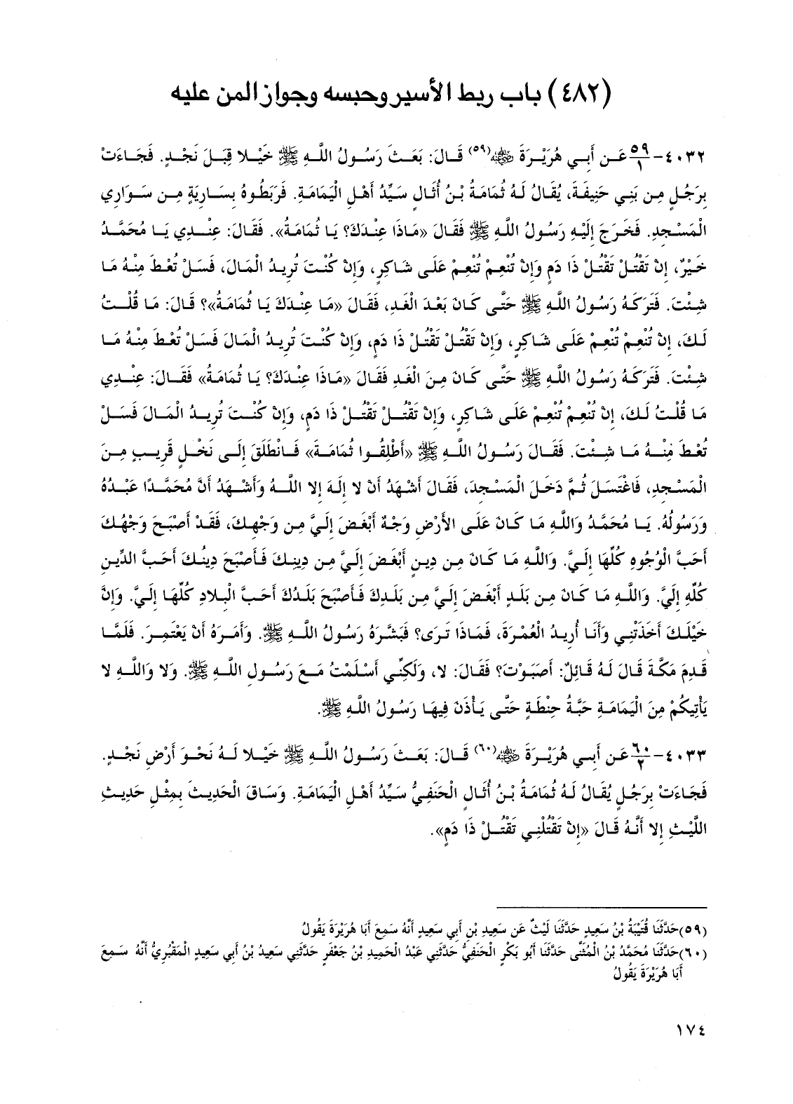 4033 - عن أبي هريرة رضي الله عنه قال: بعث رسول الله صلى الله عليه وسلم خيلا له نحو أرض نجد فجاءت برجل يقال له ثمامة بن أثال الحنفي سيد أهل اليمامة. وساق الحديث بمثل حديث الليث إلا أنه قال "إن تقتلني تقتل ذا دم".