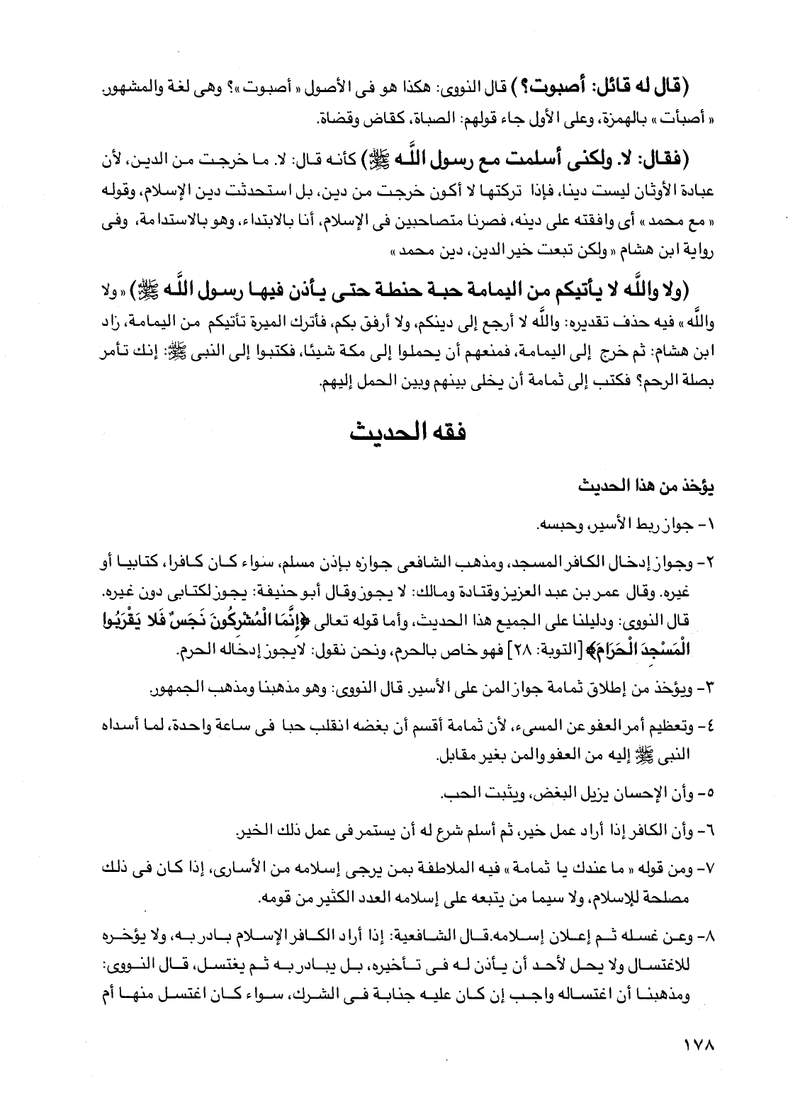 3 - ويؤخذ من إطلاق ثمامة جواز المن على الأسير. قال النووي: وهو مذهبنا ومذهب الجمهور.